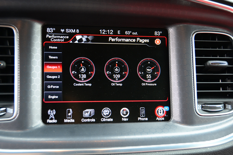 The new instrument gauge cluster with a center color LCD screen brings several vehicle information readouts to the table toggled by steering-wheel-mounted buttons. There is enough information through this screen that at any point and time you know enough to keep your Charger R/T from visiting the service center, whether it be the coolant temp, transmission temp, or your latest 0-60 mph time you logged via the popular performance pages. Hardly any stones were left unturned with vehicle controls, information and integration. To boot, many of the controls on the dashboard are easy to reach and conform to a higher level of refinement with large aluminum trim pieces around the shifter, gauge cluster and infotainment screen.
