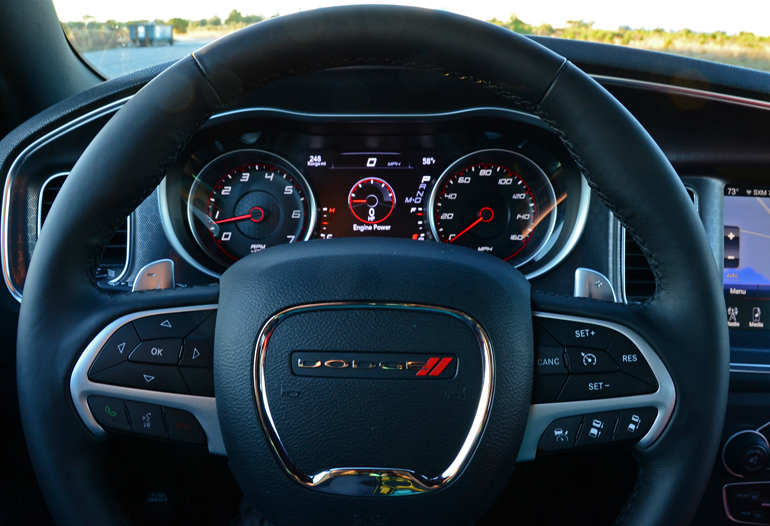 A great delight in the new 2015 Dodge Charger R/T is that you get a substantially-powered engine in its 5.7-liter HEMI V8 with 370 horsepower and 395 lb-ft of torque mated to a new 8-speed TorqueFlite automatic transmission. The combination of the HEMI V8 engine and a sport-tuned suspension on my Road & Track-trimmed Charger R/T test vehicle makes for a potent and capable performance sedan. A run from 0 to 60 mph in the Charger R/T is at a respectable 5.5 seconds, while the grip and handling abilities are left at the mercy of its smallish-patched 245/45 20-inch tires. With the R/T Road & Track package the Charger gets Sport mode II for rev-matched downshifts by way of its paddle shifters.