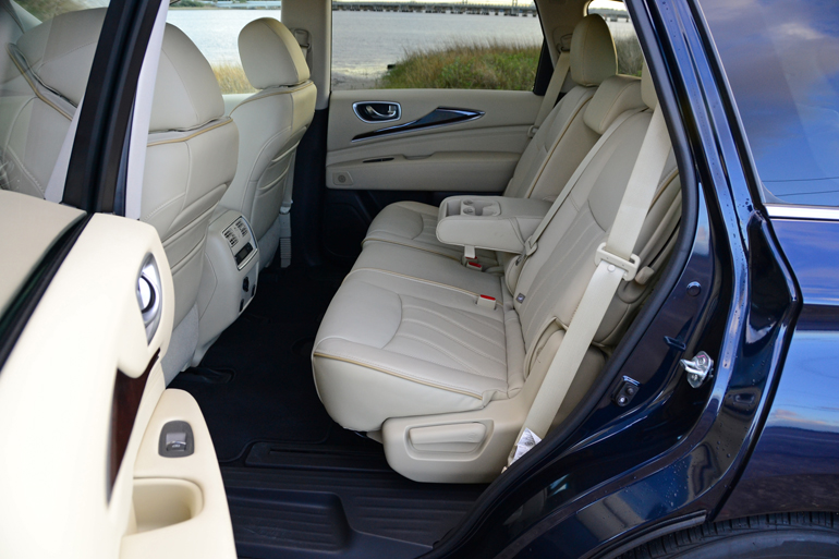 The interior of the 2015 QX60 carries over its luxury-laced appointments that exude Infiniti brand signification. The cabin of my 2015 QX60 test vehicle has many well thought out contrasts with attractive maple wood trim, several soft-touch plastics, stitched soft-touch panels and comfortable perforated leather seating areas. The seats, heated and ventilated front with heated middle row outboard seats, all fit the air of a plush luxury crossover cruiser. The versatile adjustability of the 2nd row seats adds to the comfort of your passengers giving everyone the necessary legroom and seat-back adjustments.