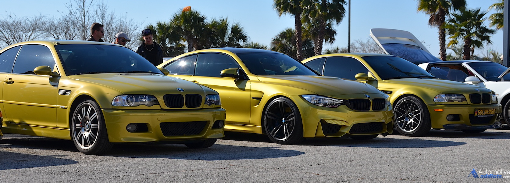 Whether it’s Aurum Dust or Phoenix Yellow finish, BMW M Cars are golden. This “Au” trio rolled into the February 2015 Automotive Addicts Cars & Coffee and made quite the impression. Enjoy the pictures and make sure to join us the second Saturday of every month for Automotive Addicts Cars & Coffee.
