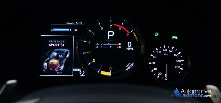 Of course, that roaring V8 requires decent amounts of premium fuel to the tune of an EPA estimated 16 mpg city, 25 mpg highway and 19 mpg combined. Those figures are frequently attainable, mostly when you opt for the Eco mode taking away the RPM gauge on the configurable LCD gauge cluster, which takes its sport mode cues from the Lexus LFA supercar.