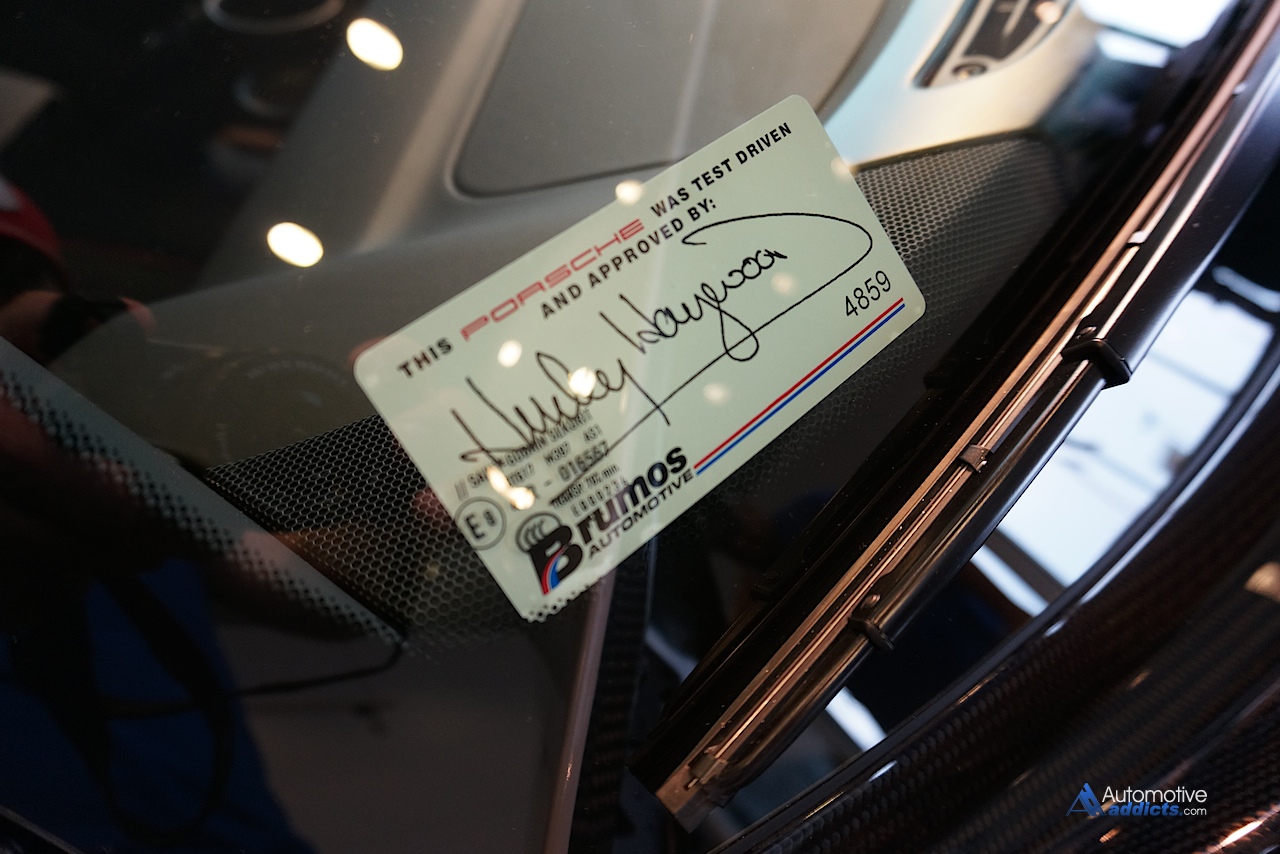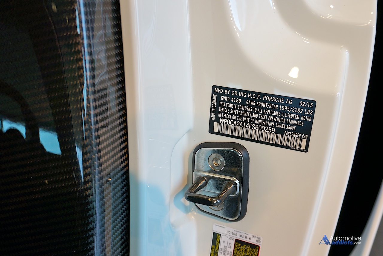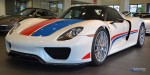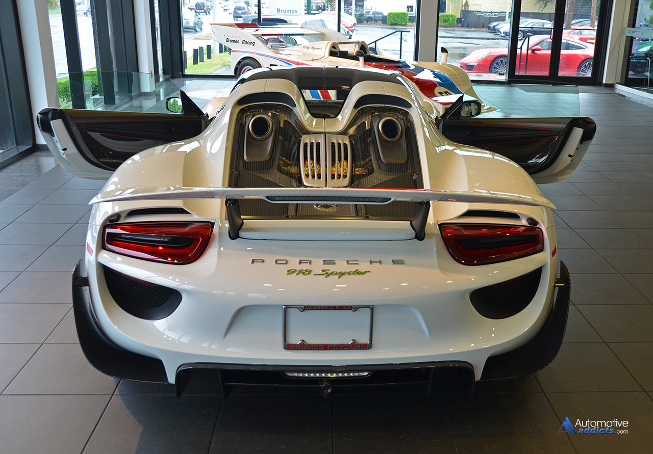 Recently, upon a rainy-day visit to Brumos Porsche here in Jacksonville, FL, thanks to Brumos Porsche general manager Ray Shaffer, we were able to receive a guided walk-around of Hurley Haywood’s new Porsche 918. Porsche’s new hypercar has captured many around the world as one of the fastest utilizing today’s advanced hybrid technology. Such a vehicle, with a price tag of about $1.1 million as it sits on the Brumos Porsche showroom floor, is a modern marvel chock full of enough gadgetry to literally (well almost) plan and launch a mission to Mars. With 887 horsepower and 944 lb-ft of torque on tap from a joint session of its 4.6-liter V8 engine and series of a 127-horsepower electric motor for the front wheels and a 154-horsepower electric motor out back, the Porsche 918 Spyder is good for a run to 60 mph in 2.2 seconds and a top speed of 214 mph. The new 918 Spyder gets these crazy numbers yet still manages to muster out 24 mpg and can travel on full electric power up to 90 mph for about 12 to 15 miles.