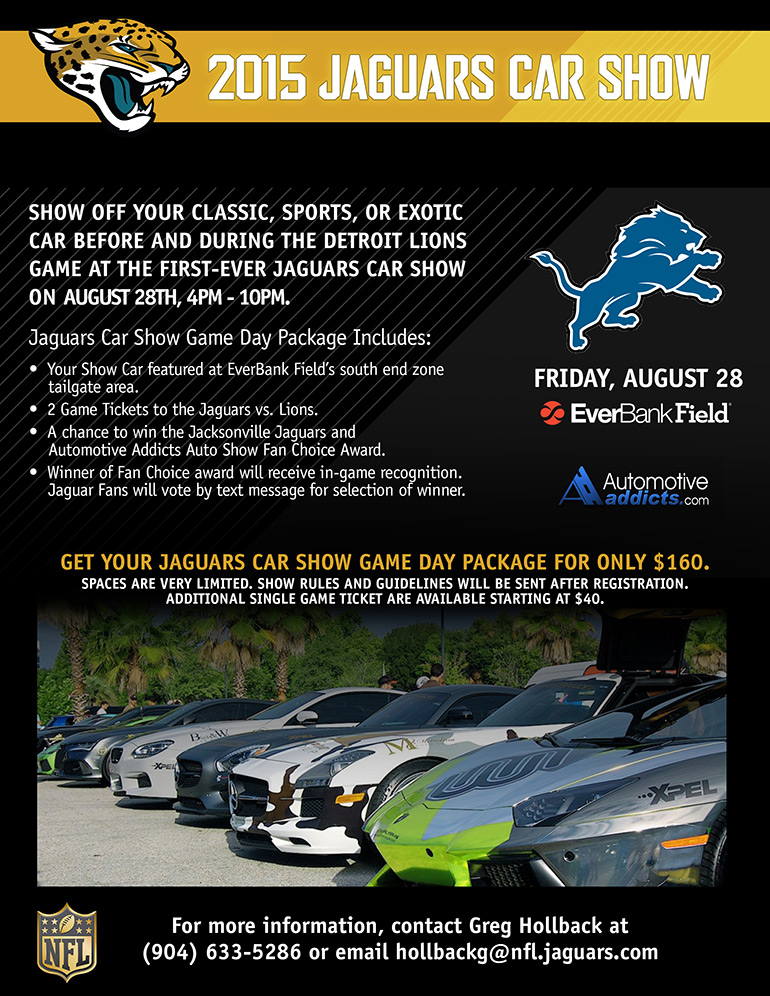 The Jacksonville Jaguars have bundled up a complete package for just $160, which includes access to feature your classic, sports or exotic car in the show, 2 game tickets, and a chance to win the Jacksonville Jaguars and Automotive Addicts Auto Show Fan Choice Award. Better yet, the winner of the Fan Choice award will receive in-game recognition as Jaguars Fans vote by text message for selection of the winner.