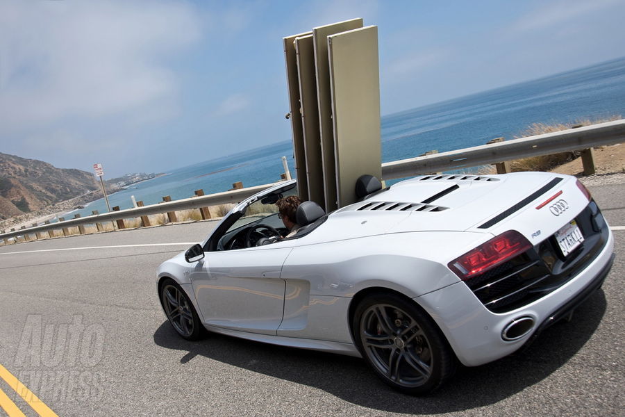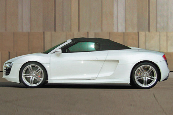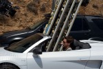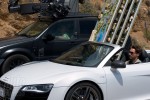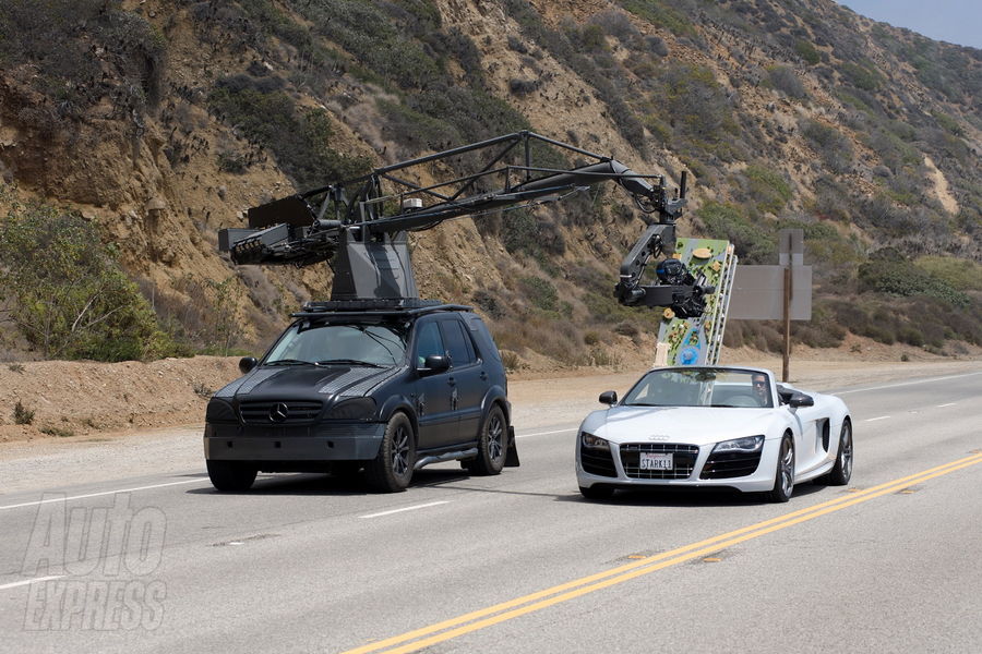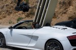 Robert Downey Jr. is seen driving in an Audi R8 V10 Spider during shooting of the film, which is scheduled to be released on May 7, 2010. In one of the spy photos, the V10 badging is clearly visible, confirming that Stark’s drop-top R8 will be powered by VW’s corporate 5.2-liter V10. With an expected 525 horsepower,the Audi R8 V10 Spider looks like our kind of Arc reactor.