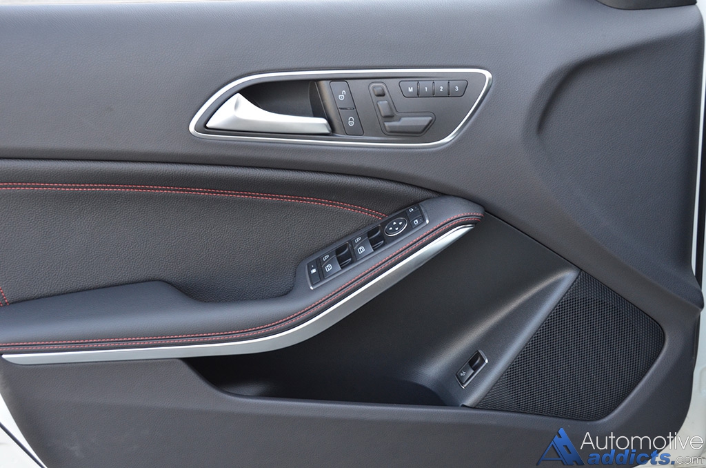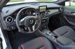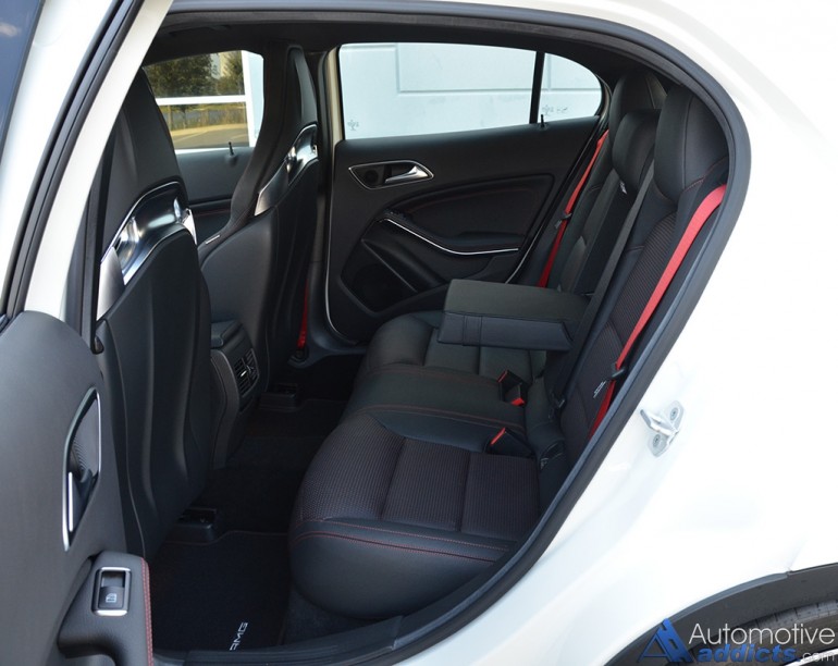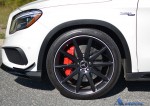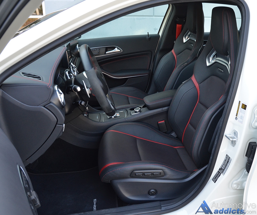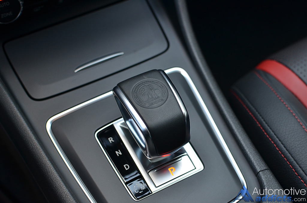While the performance nearly matches the stature that you expect from an AMG vehicle, the exterior and interior looks are just as aggressive, or even more so considering the boy-racer assortment of performance bits equipped on the GLA45. Most of that equipment is derived from an AMG options list that starts to quickly add to the $49,580 base price of the GLA45. However, most of the added equipment does have some function to nearly match its aggressive looks, such as the 20-inch AMG wheels, massively-sized red brake calipers clamping down on slotted and cross-drilled rotors, and an AMG performance exhaust. On the inside, the interior is just as enthused with red-accented stitching throughout the soft-touch dashboard, soft-touch door trim, on the flat bottom AMG steering wheel with magnesium shift paddles, and the same stitching with red stripes on the heavily bolstered perforated leather AMG sport seats up front and a flatter variety out back. All of the interior accents, including the red seatbelts and the rest of the AMG-inspired appeal, does a good job to differentiate the GLA45 AMG from its normal-run-of-the-mill GLA 250, which is otherwise rather dull inside and out with a harsh ride quality that you would only expect in the AMG trim.