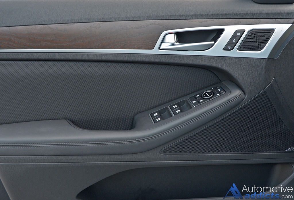 The cabin of the 2016 Hyundai Genesis 3.8 sedan is laced with a wealth of luxury appointments through clever use of minimal plastic trim pieces, plenty of soft-touch surfaces, and admirably textured wood trim. I feel that the Genesis Sedan doesn’t stand out enough inside and out while things like the clever textured wood trim should be utilized in a much more aggressive manner or contrasting color to exude a stronger taste of luxury. While I don’t have any major qualms about the Genesis Sedan’s interior, it could benefit from some boldness to garner the attention that it deserves because it has potential. However, Hyundai has gone the extra mile in some aspects, such as the soft textured plastic button surfaces, which go a long way to add another element of luxury into the overall formula. Unfortunately, in my assessment, even with my loaded up test vehicle’s heated, ventilated and power-bolstered perforated leather seats up front, the Genesis sedan doesn’t thrill enough when pitted with the likings of BMW or Lexus.