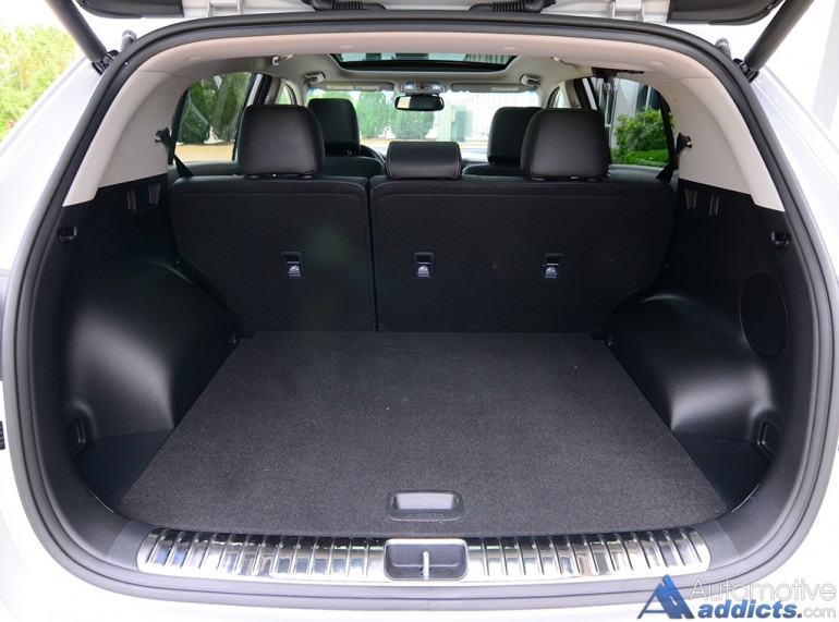 The power delivery from the 2.0-liter turbocharged engine is mostly predictable and consistent. There is very little turbo lag out of the hole, and the all-wheel-drive system keeps all four of the large-for-its-size 19-inch wheels planted to the ground without unwanted loss of traction. The driving position combined with decent visibility and assurance in handling places the new Kia Sportage SX Turbo AWD in an environment to please those who may venture from some midsize luxury crossovers. Getting up to 60 mph from a stop takes about 6.8 seconds, quite decent for the Sportage’s compact crossover class. Passing power is sufficient even when you load in four additional passengers and enough cargo to fill up the available 31 cubic feet of space out back behind the 60/40-split folding seat backs. Put the seat backs down and cargo volume opens up to just over 60 cubic feet and can be accessed by the power liftgate, which has a smart access feature that opens automatically after standing at the back of the vehicle for a few seconds.