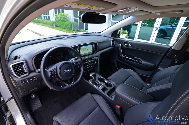 The new styling of the 2017 Kia Sportage is more of an acquired taste due to its aggressive front-end looks. The headlight bezels are more bug-eyed than a traditional look as is the grill’s uniquely sculpted design encapsulating the radar used for the forward collision warning and emergency braking system. Out back, the styling gets more contemporary but sharpens up with the use of LED taillights. The larger 19-inch wheels are a welcomed look to the Sportage SX Turbo AWD making it appear more grown-up, nearly molding into the midsized crossover category. The big 19-inch alloy wheel rollers wrapped in 245/45/R19 all-season tires seem to sacrifice a bit of the ride quality upon initial impact of sharp bumps, potholes or unevenly-paved road surfaces.