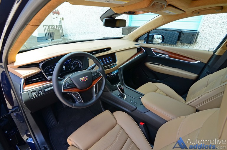 The expression of Cadillac’s luxury details are ample with the center dashboard canted in an even butterfly shape to reach a center-lined point of the vehicle. Most materials are exactly what they appear to be, from generous use of finely stitched leather encasing suede, wood, and aluminum trim, which all come together to emit a true taste of luxury. The limited amount of plastics are smartly placed in areas that are hardly touched and there is an abundance of soft-touch surfaces and a suede headliner surrounding the massively-sized panoramic power-sliding sunroof with a power-sliding sunshade that blocks all visible sun rays when closed. Cargo space in the XT5 behind the rear seats when in place is 30 cubic feet, and opens up to useful 63 cubic feet with the rear seatbacks folded down, which is rather generous for the midsized crossover segment. Towing capacity is 3,500 pounds for all trim levels.