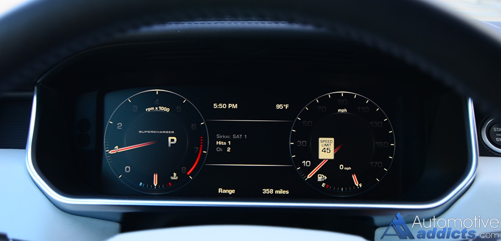 Most materials are soft-touch and wrapped with leather throughout the cabin except the piano-black plastic and brushed aluminum trim. There isn’t anything left out of the luxury theme in the latest Range Rover Supercharged LWB. The use of the infotainment system can be a bit annoying at times with slow responses to your input and a few confusing menu screens. Additionally, the available-at-anytime 360-degree camera system is more useful for going off-road than it is to get a representation of what’s around the vehicle when parking unless you only utilize the default rear camera for a single rearward perspective. Fortunately, the 360-degree parking sensor system is there to alert you progressively as you approach objects with the living-large Rover. The dashboard controls and large 12-inch driver’s gauge cluster are all simplified and easy to use. Entry and exit of the Range Rover Supercharged LWB is also simplified thanks to an access height setting for the air suspension that will automatically lower the vehicle by a couple of inches if it is set to do so.