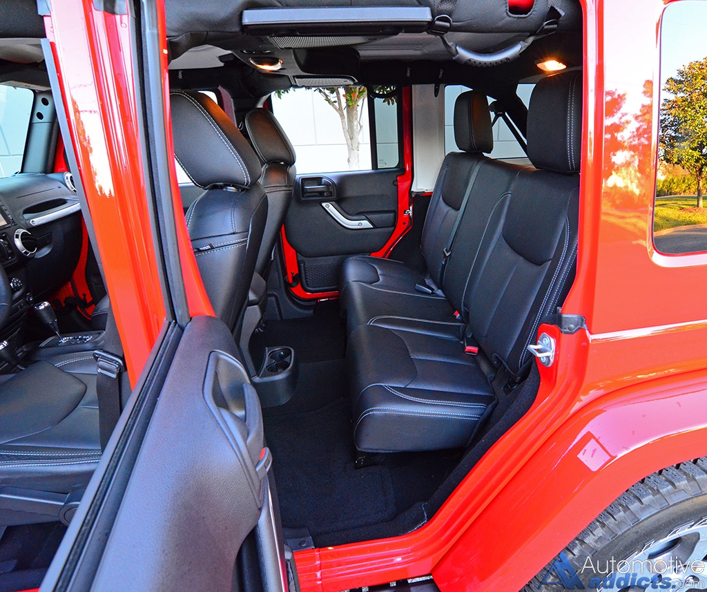 Fortunately, the Jeep Wrangler Sahara Unlimited in its longer wheelbase and 4-door form permits a better ride quality and balance over the shorter wheelbase variations. The added versatility of the Sahara Unlimited trim is welcomed with several amenities, such as heated leather seats, 60/40-split folding rear seat backs, larger gas tank, automatic air-conditioned climate control, and a touchscreen infotainment system with GPS navigation.
