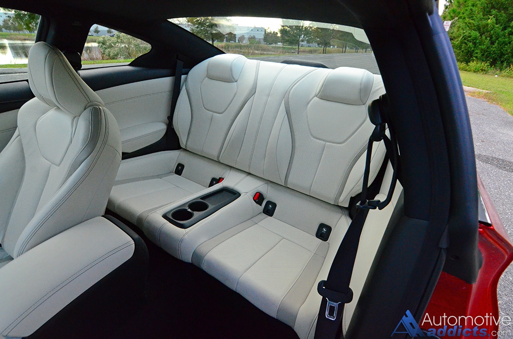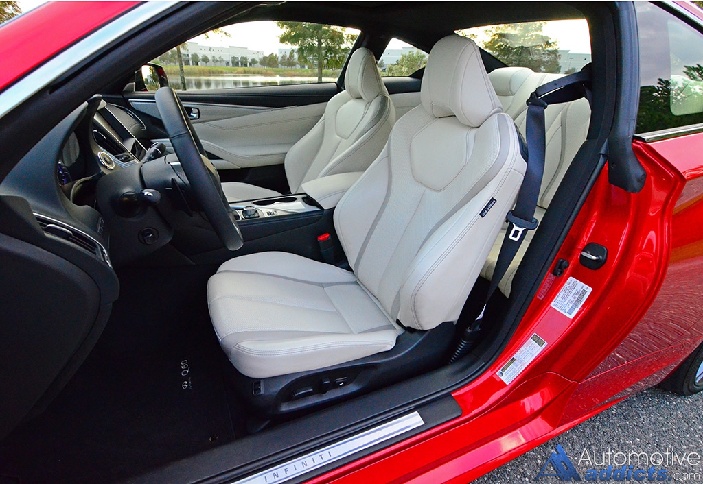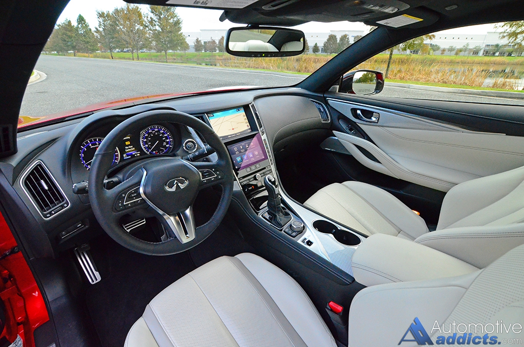 The Infiniti Q60 Red Sport 400 with its new VR-series engine (VR30), which pays homage to its exotic GT-R sibling’s VR-series engine architecture, is eager to get the Q60 up to 60 mph in just 4.4 seconds. The power from the engine is strong and has a wide power band that the 7-speed automatic transmission, a long-time proven powerhouse for the brand, loves to stretch out at times. The combination works in harmony to lay the power down efficiently, sometimes riding long through a gear from low RPMs utilizing all of the available torque. The torque comes on early, which surges near its full potential from 1,600 rpm to 5,200 rpm. The twin-turbo V6 in the Q60 Red Sport never feels inadequate. In fact, the engine seems like it is sometimes too much for the chassis of the premium coupe. The new Q60 coupe is based on the premises of a coupe version of its Q50 sedan sibling.