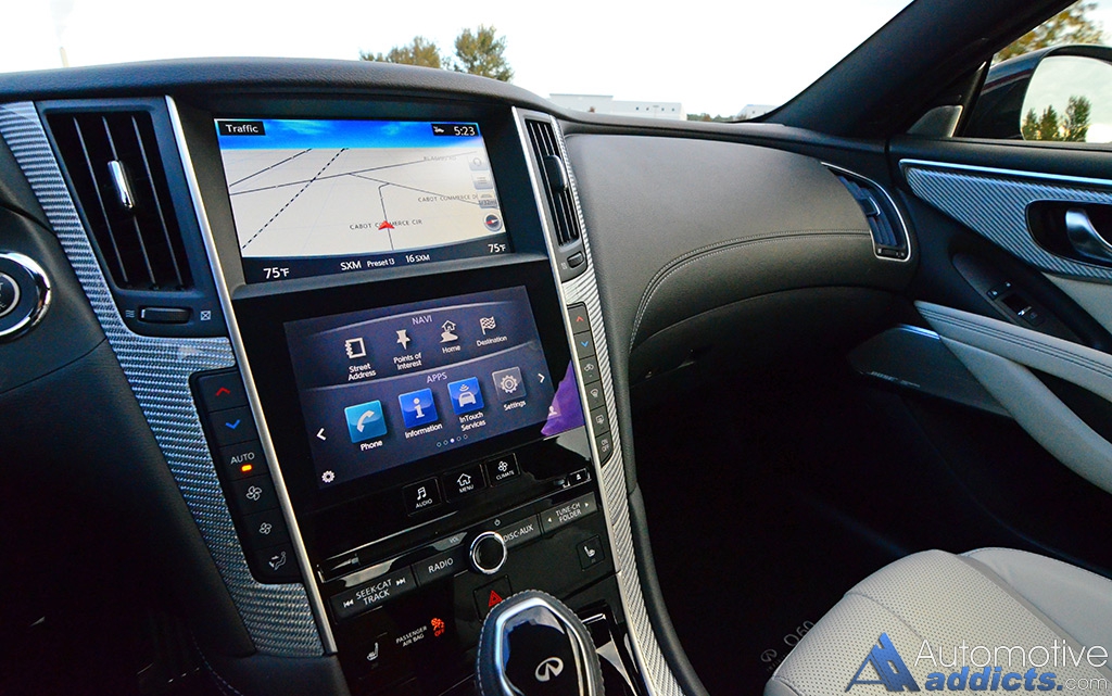 Infiniti ventured into a new realm with its new dual-screen infotainment system in the Q60, dubbed Infiniti InTouch. The newer unit, first introduced a few years back on the Q50 sedan, has received updates to improve upon its response. The drawback here remains to be that the system requires a steep learning curve with an abundance of system menus, settings, and app features that appear to be somewhat scattered. It took me the better part of my week with the Q60 to become acclimated to the core functions, while I still had trouble quickly accessing other essential settings. To sum it up, the lower screen’s complexities make the system unintuitive. The upper screen is used more for navigation map display and limited information and incorporates pinch-zoom and drag features, much like today’s smartphones. The lack of many physical buttons forces you to utilize the lower screen to bring up features that are thought to have their own button, such as the control for the heated steering wheel. I will say, the 13-speaker Bose Performance Series audio system isn’t lacking when it comes to integration and connectivity, which includes Bluetooth audio streaming, iPod USB connection, USB device connection, Auxiliary connection, CD-player, Sirius XM, FM/AM, and audio apps.