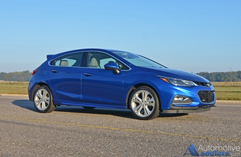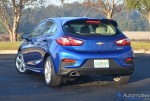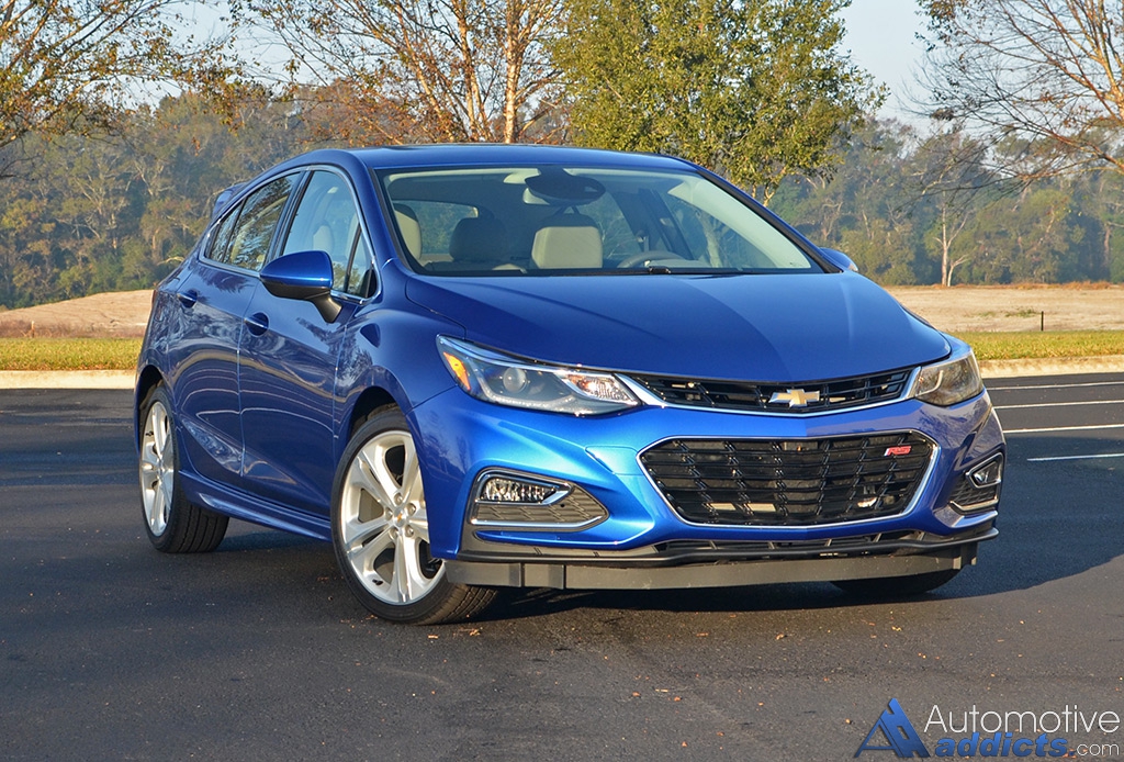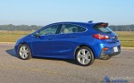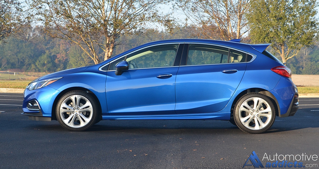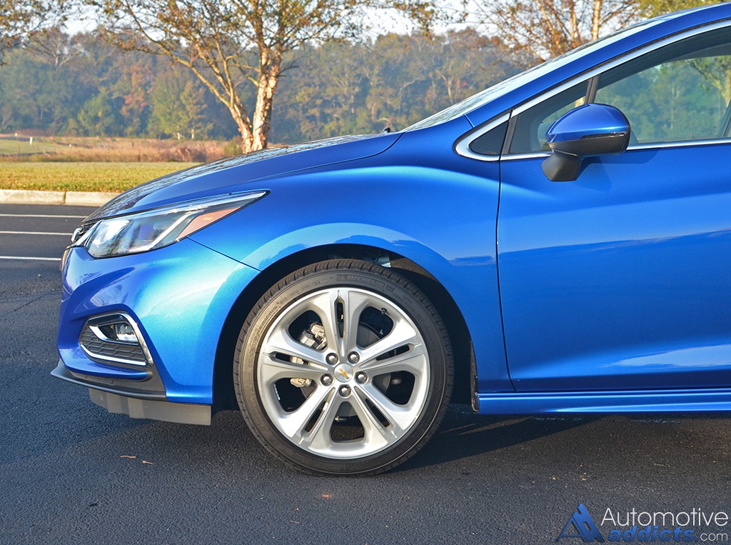The new 2017 Chevrolet Cruze Hatchback starts at $22,115 but quickly climbs to my test vehicle’s price of $29,860 after opting for the top-tier Premier trim level, which adds several desirable features, such as an 8-way power driver’s seat, passive entry w/push-button start, remote vehicle starter, leather-appointed seating surfaces, ambient lighting, and larger 17-inch wheels (my test vehicle has 18-inch wheels in place of the standard 17-inchers due to an optional RS Package). Other features equipped on my test vehicle that brought the price to just north of $29K include an Enhanced Driver Confidence I and II Package (forward collision alert, lane departure warning with lane keep assist, rear park assist, blind zone alert, rear cross-traffic alert, auto high-beam headlights), Enhanced Convenience Package (heated rear outboard seats, 110-volt power outlet, wireless charging, auto-dimming inside review mirror, auto climate control), a Sun and Sound with Navigation Package (power sunroof, Chevy MyLink w/Nav, 9-speak Bose audio system) and a RS Package that includes 18-inch alloy wheels and fog lamps.