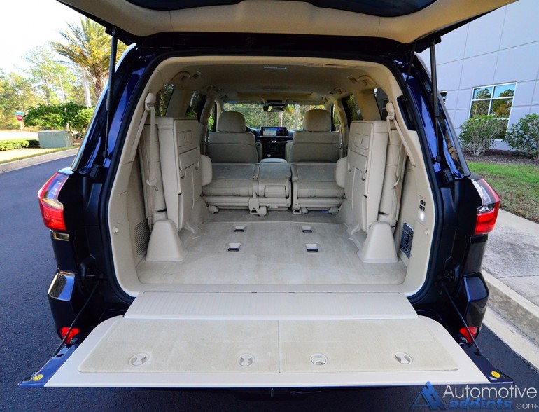 The Lexus LX 570 comes as one trim with all of the goodies, with the exception of a few add-on features, such as a DVD entertainment system to keep rear passengers happy as they explore roads less traveled in luxurious high-riding style. Speaking of passengers, the cabin of the new LX 570 is plush, almost too plush to think that the LX has proven off-road capabilities that keep up with the competition. The front and middle row seating have climate controlled seats with the right amount of bolster support for such a vehicle. The middle row has a power slide feature, but the folding method remains to be a bit cumbersome as it requires physically maneuvering the seat through a spring-assisted fold mechanism. Out back, the third row is a bit disappointing as it looks to have the potential to fit three adults but you quickly find out seating two is the desirable choice. Another caveat of the third-row is it cannot be completely folded out of the way on the floor when you want to store items in the cargo area. Instead, the third-row does a power-folding act out to both sides of the vehicle. Here, the seats remain somewhat in the way. With all seats in their folded positions, you have just over 83 cubic feet to work with. Otherwise, there is 9.1 cubic feet behind the third-row.