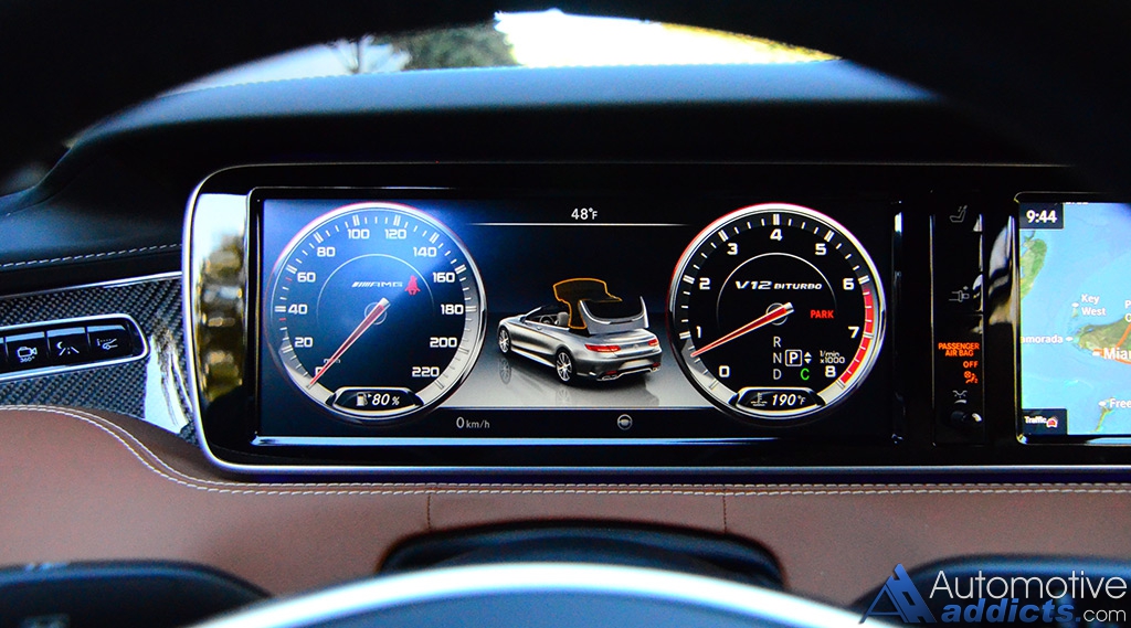 Apart from the many surprising aspects that you expect a BiTurbo V12-powered convertible to bring to the table, the S65 Cabriolet is well endowed with supple luxury. The cabin is mostly laced in soft leather and fine stitching. The only hard surfaces are a tasteful selection of carbon fiber trim, tactile-feeling metal-trimmed vents, and a welcomed high-quality feel of metal-surfaced buttons and knobs throughout. Mercedes-AMG left no stones unturned when it comes to making the cabin feel world class, as it should when you glance at the price of admission for driving such a vehicle.