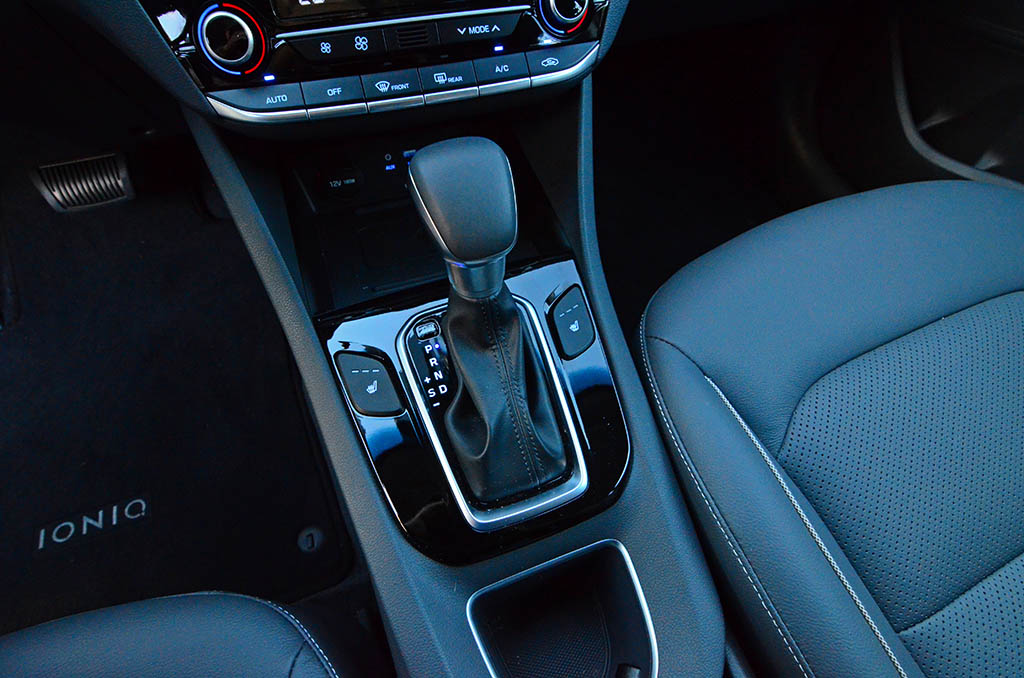 My assessment of the driving nature in the Ioniq is that its ability seldom switches to full electric power to maintain highway speeds is a great benefit to add fuel efficiency. Moreover, the 32-kilowatt electric motor appears to be extremely efficient as it quickly transitions to feed the lithium-ion battery back upon regenerative braking. Hyundai did well here with just about every aspect of the power transition moments and taking use to the direct dual-clutch transmission that remains to be puzzling due to its rather lazy shifts that would otherwise be expected to happen much faster than the due in the Ioniq. I can’t help but think that the dual-clutch auto transmission is sapping some of the excitement out the drivetrain, which could have been a bit livelier in Sport mode. However, in Sport mode, there is a bit more deceleration which aids in regenerative braking as well as a livelier throttle mapping for a better mid-throttle advancement and feel. The gas engine also kicks in sooner in sport mode rather than being more of a “helper” in the default Eco mode coming to the aid to get the Ioniq up to speed and then rest on the use of the batteries middle of the row battery power reserve.
