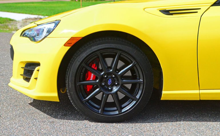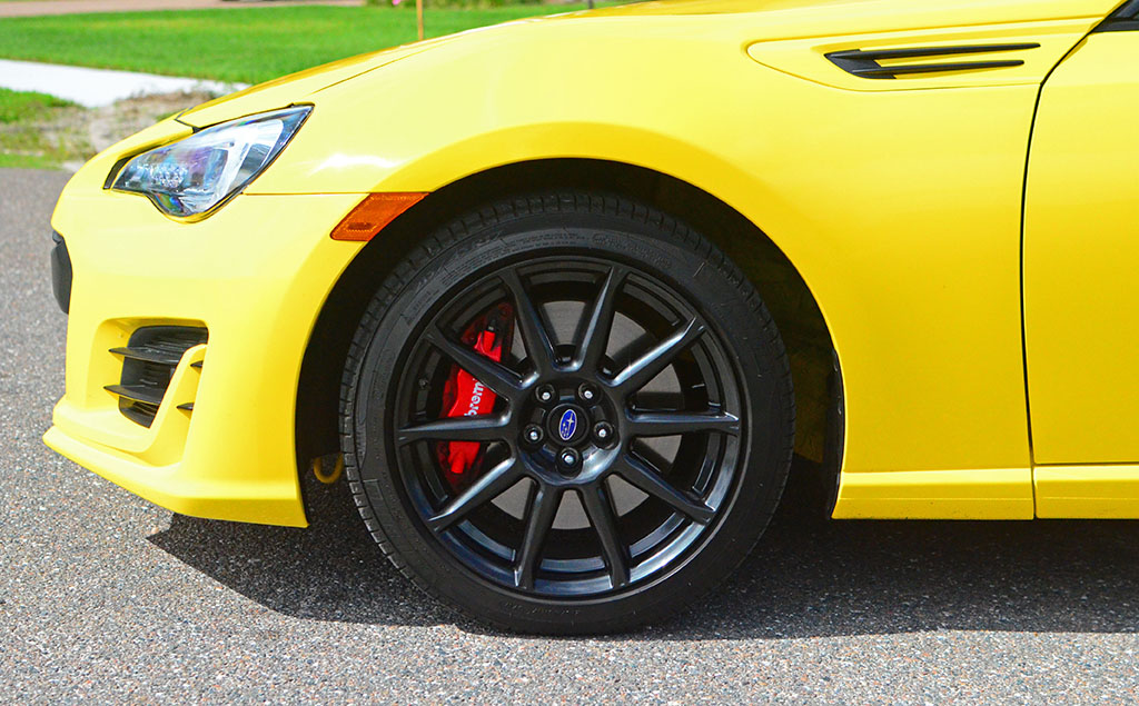 With the direct-injected flat-4-cylinder engine mated to a 6-speed manual transmission, the BRZ is a fun mix. The larger brake rotors over the normal BRZ, 4-piston front and two-piston rear Brembo brake calipers, Sachs dampers, and wider 17-inch wheels at 7.5-inches wide all add to the concept of a more effective vehicle when pushed to its limits by the way of the optional $3345 performance package found on the BRZ Series.Yellow.