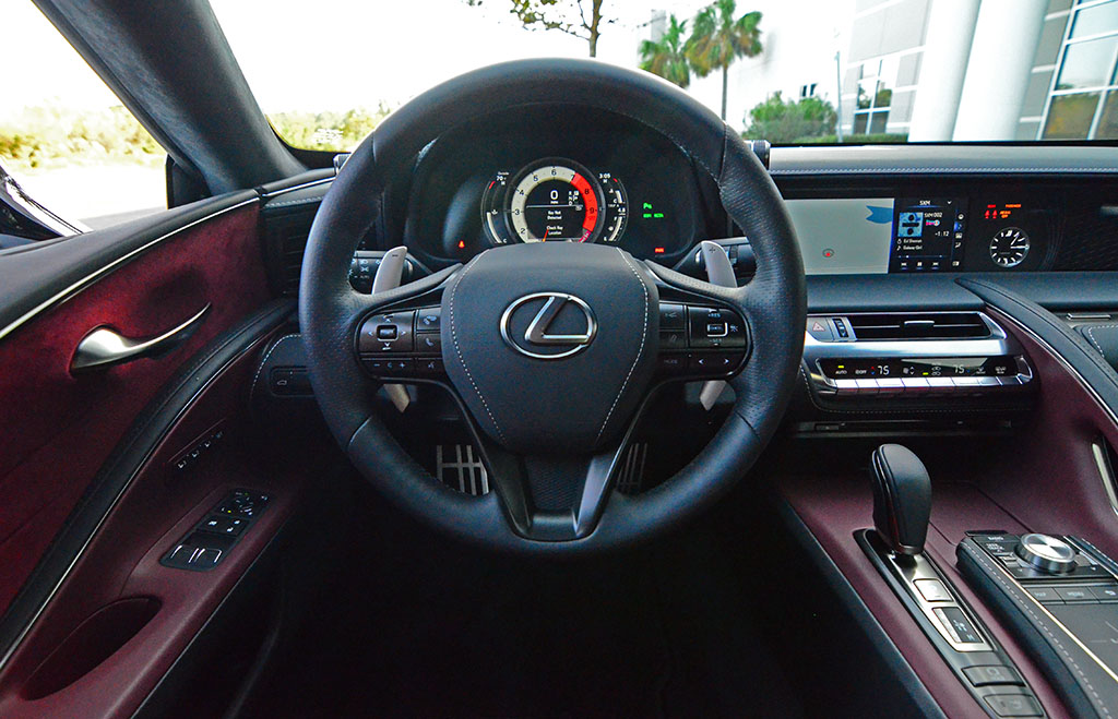 Where the LC 500 shines for enthusiasts is the steering, which is rather sharp and quick. Thanks to rear-wheel-steering, which angles the beefy rear 275/35RF21-inch tires a couple of degrees in the opposite directions at lower speeds, the LC turns in excellent. In fact, the rear steering feels as if the wheelbase of the LC has shrunk enabling you to maneuver around bends with ease and fit into tight parking areas without worry. While the LC 500 touts a portly body weight, tipping the scale to nearly 4,300 pounds, it feels as if it is much lighter allowing both the adaptive dampers and rear steering aid to a nimble feel.