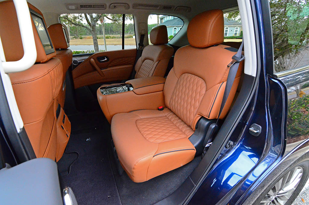 The versatility of the QX80 is one of its main selling points in that there is a respectable amount of cargo space behind the third row of seats while seven passengers can enjoy comfortable seating. Though, access to the third row is becoming a dated act as it requires a pneumatic folding of the second-row chairs or captain’s chair leaving a slightly narrow path to the back. However, there is enough room for three (average sized) adults to sit out back without worrying about shoulder or leg room.