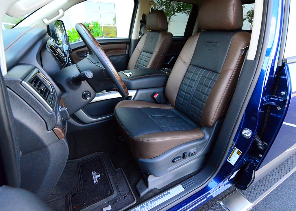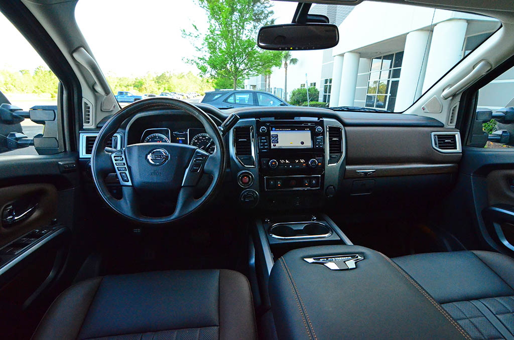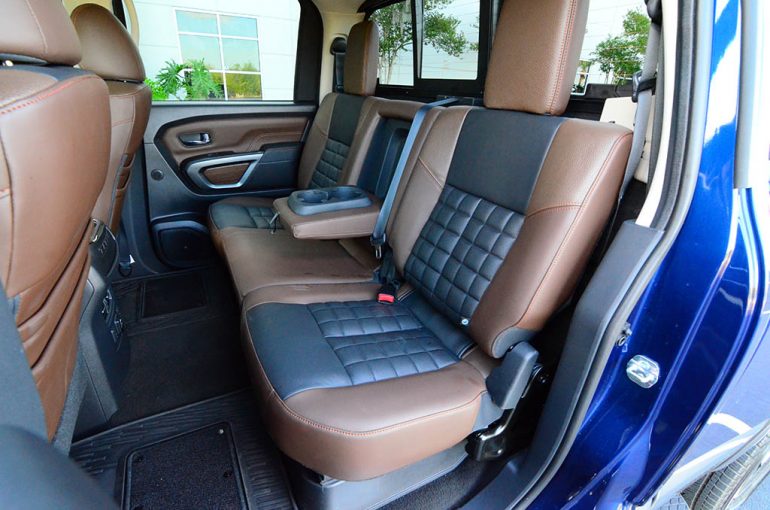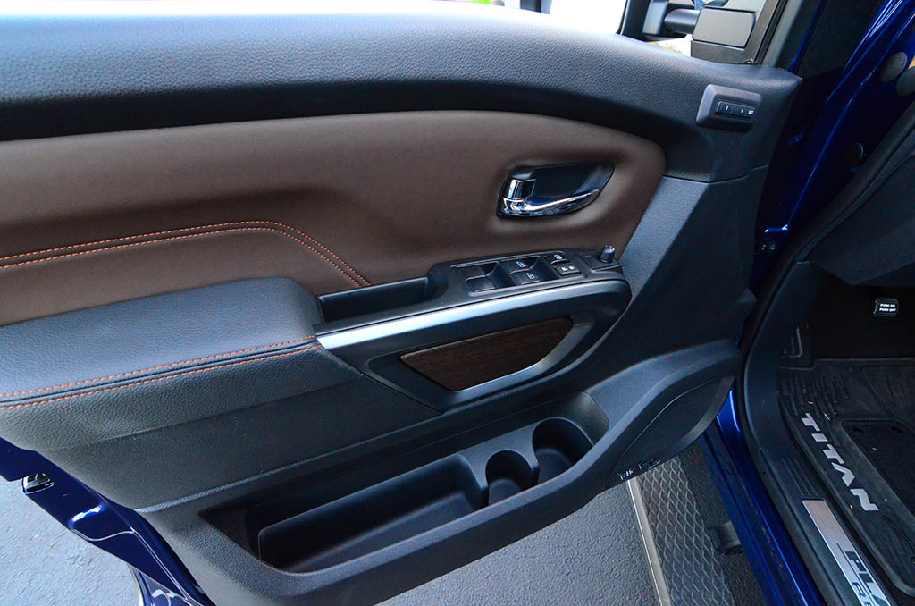 The cabin of the new Titan XD Diesel in the Platinum Reserve trim serves a multi-purpose with a slight taste of luxury. The two-tone and perforated leather seating surfaces are comfortable and it’s rather easy to find your optimal seating position. Seating areas are spacious and there are just enough soft-touch surfaces to warrant paying over $60K for such a truck. The power steering column is somewhat slow to respond to find a desired position. Many of the controls are clear and straightforward.