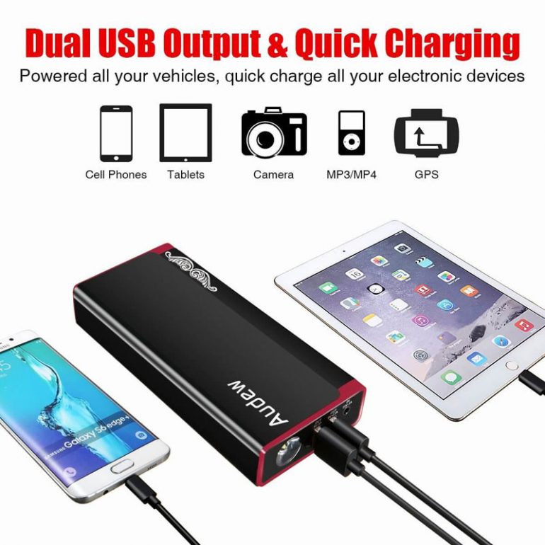The Audew Portable Car Jump Starter has many benefits outside of only jump-starting an engine up to a 5-liter V8 or a 3-liter Diesel engine. It can act as a portable charger for a multitude of devices through one of its dual USB ports with the supporting Apple iPod, lighting iOS device connector, and micro-USB device cable. Additionally, the unit can supply vehicle power through the cigarette lighter or receive a charge from such.
