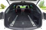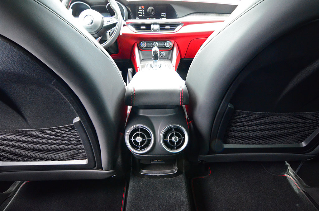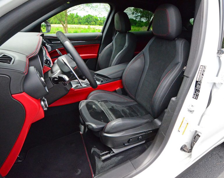 For the most part, the compact-ish size of the Stelvio isn’t compromised with small seating areas as there is just enough space for most combined with supportive seats with the proper aggressive bolstering, Alcantara suede-like seat surfaces, and easy-to-find seating positions up front. The seat adjustments are somewhat limited by the Stelvio Quadrifoglio’ s 8-way power adjustment for the driver’s seat. Out back, the seating area is just enough for two adults and one child in the center, but I wouldn’t push anywhere past someone who is close to 6-feet tall with long legs as they may find some limitations with only 31.9 inches of rear legroom. Cargo space, accessed by a power liftgate, is also somewhat limited with just 18.5 cubic feet with the rear seats up and up to 56.5 cubic feet in folding the 60/40 seat backs down.