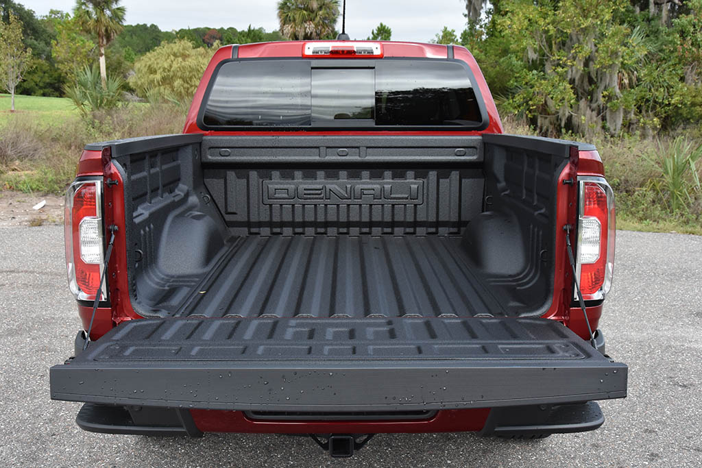 Driving the 2019 GMC Canyon Denali out on the road with the 4WD system put in its Auto setting provides a comfortable ride quality with an assuring footing. The Canyon behaves well on the road and is more car-like than ever before. Moreover, the V6 engine with its 8-speed automatic transmission tow up to a respectable 7,700 pounds, which leads the pack in its segment. Out in the lined bed you can expect to haul up to 1,620 pounds without issue.