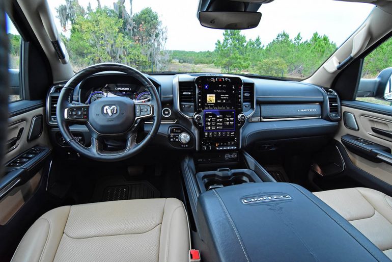 The capabilities of the Ram 1500 Crew Cab with the 5.7-liter HEMI V8 enable the ability to tow over 12,000 pounds (best-in-class V8) and haul 2,300 pounds in the bed accessed by a damped and remote-actuated tailgate. The somewhat knobby 275/55R20-inch tires of my test vehicle proved to be mostly smooth on the road without much noise and still grapple at soft sand and ruts when going down questionable surfaces.
