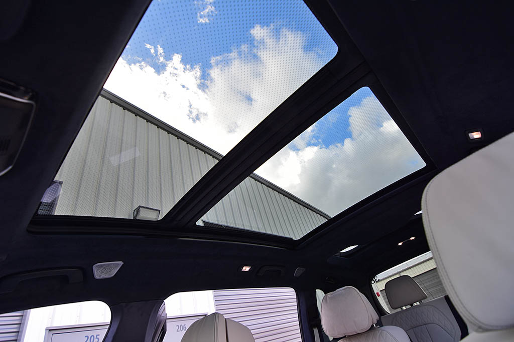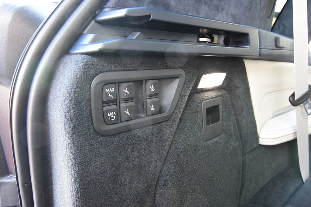 For once, the new three-row full-size BMW X7 SUV adorns the second-row with a bounty of features, such as multi-way power-adjusted seats, heating, cooling, massively-large infotainment touch screens, soft pillow headrests, ample leg room, and easy power-folding access to the third row of seats. BMW didn’t leave any stones unturned with the new X7 – the third-row seats even have their own climate-controlled zones and enough room for two adults to sit comfortably with their own power sunshade for a sliver of a glass roof. The rest of the glass roof serves the front and second-row passengers and delights them with a gigantic SkyLounge LED-lit glass panoramic roof that changes colors for a mesmerizing twilight effect at night.