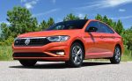 With the decent fuel economy, the Jetta still scoots along pretty well even with 147 horsepower on paper. The extra grunt from the smallish turbocharged 4-cylinder engine is due to its torque figure of 184 ft-lbs., which gets the relatively low-weight (2,959 pounds) Jetta up to 60 mph in about 8.4 seconds – not fast by any means but not the slowest around. At low speeds around town, the Jetta has good power. It’s not until you reach highway speeds or push the engine to its redline where the turbo 4-cylinder starts to give out. The engine is mated to an 8-speed automatic transmission that feels very direct as it limits slipping of the torque converter and fires off shifts without confusion. There’s nothing really sporty about the new Jetta’s driving character. Most of the sportiness resides with the R-Line trim’s exterior looks and new overall shape of the coupe-like proportions of the sloping roofline.