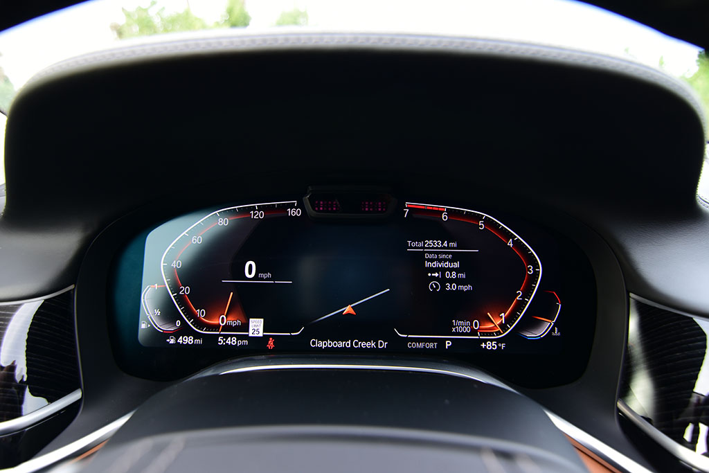 Performance of the new 2020 750i, which trumps the 740i, is surprising for such a large vehicle. While the standard air suspension of the 750i is soft in the default Comfort mode and even softer in Comfort Plus drive mode, the 750i manages to keep its composure, much more than something like the new Audi A8L. The Integral Active Steering system virtually shortens the wheelbase by steering the rear wheels at certain speeds, which comes in handy to maneuver the large 7 Series. The dynamics of the road preview feature of the suspension system to preload the adaptive dampers for upcoming road imperfections combined with the quick reactions of the system to firm things up in an instant are welcomed to balance all 4,722 pounds of heft. I will say, the 750i does exhibit a bit of body pitch when accelerating, in addition to some slight lofting when its pushed near its limits. There’s often a reminder that you’re far from driving an M vehicle with all that the 750i offers, even though its engine is powerful enough to get the German luxury cruiser up to 60 mph from a standstill in just 3.9 seconds using a convenient launch control feature.