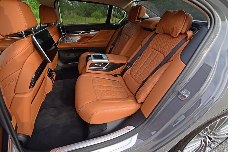 The interior of the new 7 Series is somewhat refreshed but falls in line with the rest of the lineup without any surprises, other than the added passenger volume that “fits” the theme of a 7 Series. All of the expected luxury amenities are in place in my nicely-equipped test vehicle, including the optional Luxury seating package and Executive package, which together add front and rear comfort seats with massaging, heating, ventilation, and several power adjustments. Adding to an inviting luxury environment is a new Panoramic Sky Lounge LED roof, which has a matrix of imprinted dots along the glass that are illuminated by LED lighting for a twilight effect.