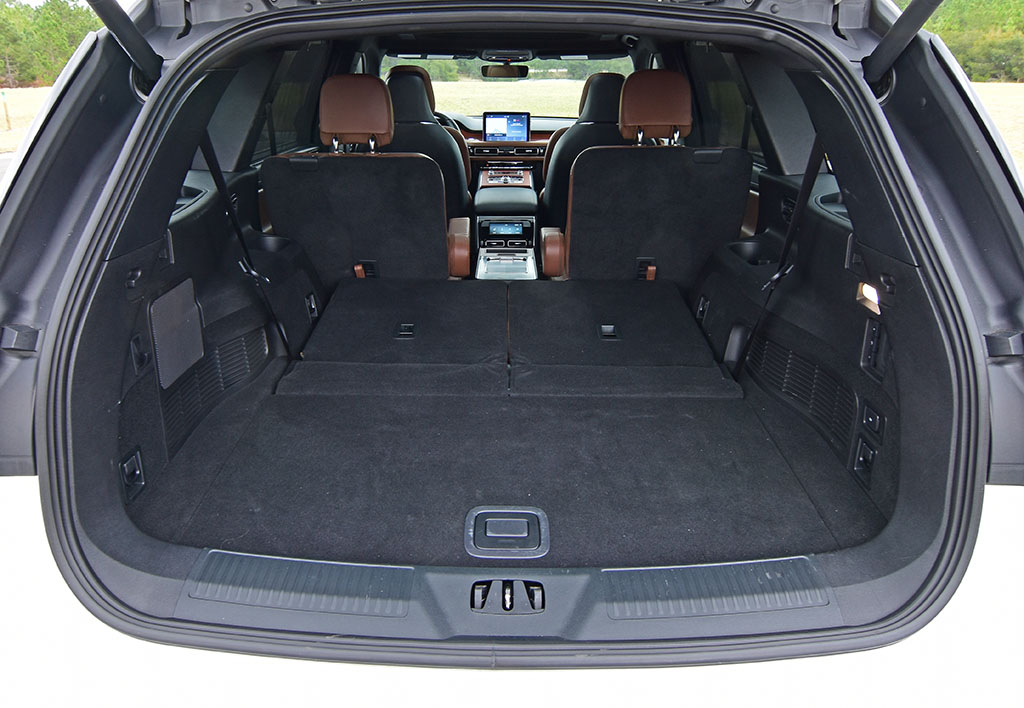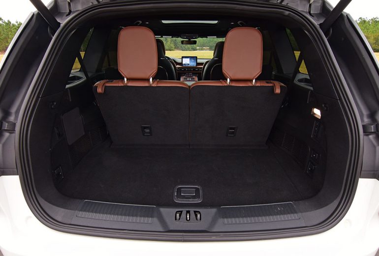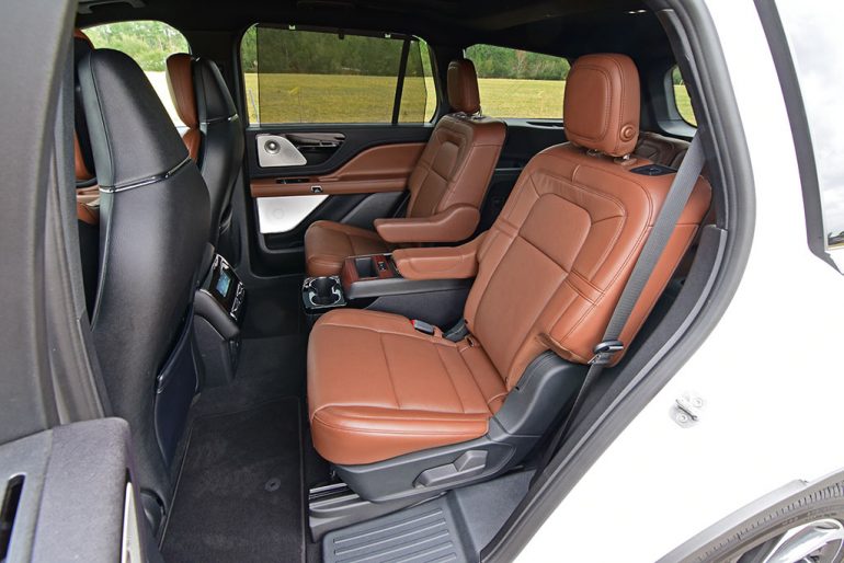Most will notice that the Aviator somewhat follows the theme of its larger Navigator sibling, which is also a good thing considering how the new Navigator took its king-of-the-hill place for its segment. The “perfect position” 30-way adjustable heated, cooled, and massaging seats that come as part of the Reserve II equipment group (Luxury Package), are supportive and comfortable at the same time. One thing to note is the 30-way seats do take a while to find an optimal adjustment. Just jumping in the front seats and making a few quick adjustments hardly ever suffice to feel right, no matter how tall, short, small, or big you are. In the second row, there’s heated and cooled seats (outboard seats with the bench) and a good amount of legroom to spare. The Captain’s chairs have relatively accommodating adjustments and comfy wide armrests. Getting into the third row is somewhat easy at the press of a button to ‘spring’ the second-row seats forward. The third row is low and more accustomed for smaller children, or two adults in a pinch, as you would expect in a midsized crossover that seats six or seven. Behind the power-folding third row of seats is a good amount of cargo room, a bit more than a lot of the Aviator’s luxury competition.