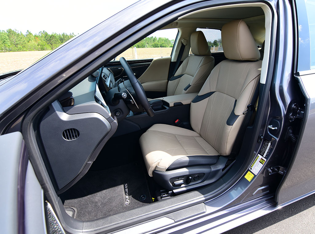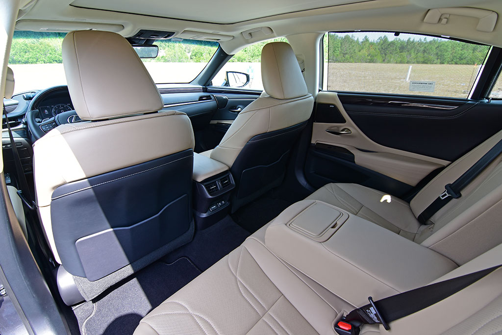 The larger proportions of the midsized ES 350, with class-leading leg room up front and out back, nearly rival full-size luxury vehicles. The long doors are almost a giveaway to the ample space inside of the new Lexus ES 350. The seating is comfortable, and in my Ultra Luxury test vehicle, there’s a bit of extra treatment given with semi-aniline perforated leather front seats with 14-way power adjustment for driver’s seat and 8-way front passenger’s seat. There’s also automatic heating and ventilation for the front seats, manual rear passenger sunshades, a power rear window sunshade, a massively large power-sliding panoramic glass roof with a power sunshade, and a power opening and closing trunk lid. All of the other expected luxury amenities and features are available, such as a heated steering wheel, a large 10.2-inch color heads-up display, Mark Levinson 17-speaker audio system, wireless phone charger, a bevy of active safety features, and a new 12.3-inch infotainment screen.