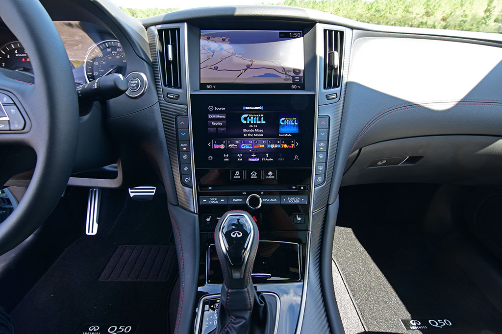 On the side of tech, the Q50 attempts to stay relevant by using the basic fundamentals of its two-touchscreen infotainment unit that’s been slightly updated in the past couple of years. Some of the updates include Apple CarPlay and Android Auto integration and faster processing. Other aspects of the Q50 feel a bit outdated, such as the instrument cluster, a manual parking brake pedal on the floor, and the 7-speed automatic transmission. Otherwise, the Q50 Red Sport is a “red hot” luxury sports sedan poised with ample performance and attractive looks thanks to the unique exterior color, darkened trim, and carbon fiber accents found on the mirror caps and rear spoiler.