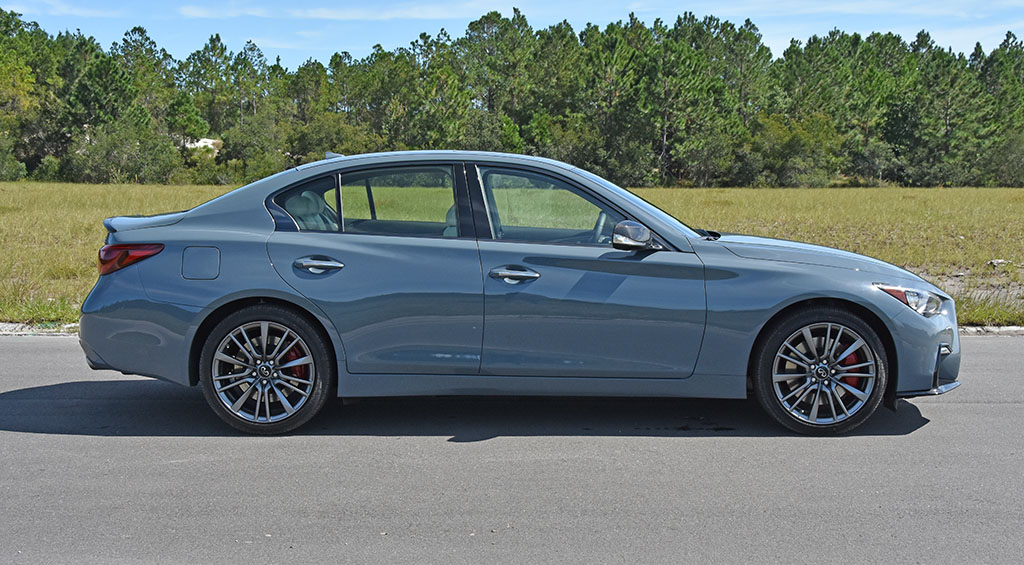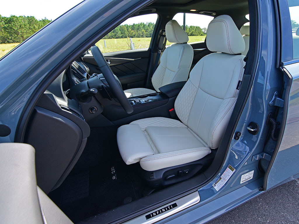 My test vehicle for the week, adorned in unique premium ($695 added) Slate Gray paint color and in the all-wheel-drive Q50 Red Sport trim, touts one of my favorite V6 engines in the past couple of years. The V6, as I have enjoyed in many other Q50 Red Sport and Q60 Red Sport test vehicles in the past couple of years, is a masterpiece. Its 400 horsepower and 350 lb-ft of torque are unapologetic and thrust through the respected chassis of the Q50 with eagerness and no lag or shyness. The only downfall for the engine is the somewhat antiquated 7-speed automatic transmission. While the 7-speed unit used to be praised, it has been surpassed by other transmissions in the crispness of shifts and the overall response to throttle inputs for modulating downshifts. Still, the Q50 Red Sport in the all-wheel-drive setup is good to get up to 60 mph in just 4.5 seconds with no drama or loss of traction. The rear-wheel-drive setup with a system feeding power the front wheels as well, firmly plants the 19-inch squared-size tires front/back to the ground. The 4-piston caliper brakes up front and two-piston out back do a good job to shave speed when needed. Fuel economy could be better, especially compared to other vehicles in the same class. However, I found it to be mostly consistent and matched the EPA-estimates of 19 mpg city and 26 mpg highway.