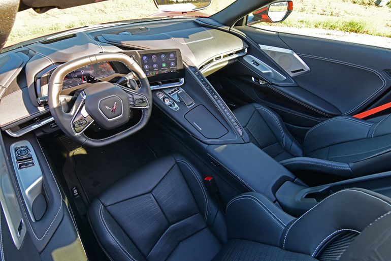 The cockpit of the new Corvette, which is the proper name for such an interior, is just that, a space the wraps around you and encapsulates you with a plethora of buttons and tech. From the unique drive modes displayed on the 12-inch configurable gauge cluster and exclusive drive modes, to the unique squared-off steering wheel and ultra-comfy but sporty seats, the Corvette’s interior is quite the inviting space for a supercar. Surprisingly, the seats are very comfortable, yet they remain supportive with the proper deep bolsters for navigating tracks and twisty back roads. GM left no stones unturned with the Corvette. If I were to nitpick and find something that I didn’t like (I have to look hard), it would be the exhaust sound through the lower powerband that is just too quiet. Under full throttle, the exhaust sounds “good” but not great. Also, the styling of the new Corvette is something that has to finish growing on me as the rear quarter and back-end has me a little mixed about a full-on love affair with the Vette.