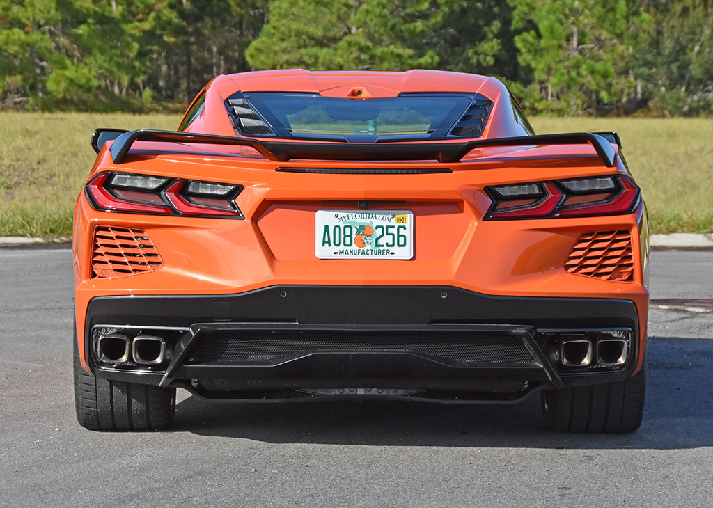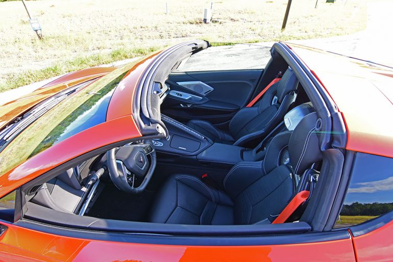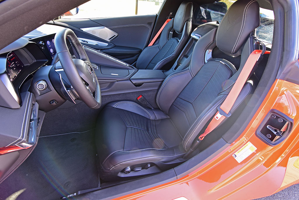 If you didn’t already get my drift about all of the pricing hints in my words that the Corvette is a bargain, then let me tell you – the new 2020 Corvette is a bargain!!! We’re talking about a starting price of $60,000, and my nicely-equipped test vehicle with its head-turning Sebring Orange paint tests out at $79,315, which includes all of the Z51 package goodies (performance exhaust, performance brakes, electronic limited-slip differential, Z51 rear spoiler, high-performance run-flat tires, heavy-duty cooling system), the 2LT coupe preferred equipment package, GT2 bucket seats, front lift system, orange seat belts, 19-inch front and 20-inch rear wheels, and body color exterior accents that in my opinion make the side profile of the Corvette look better than ones with the black accent around the side intakes.