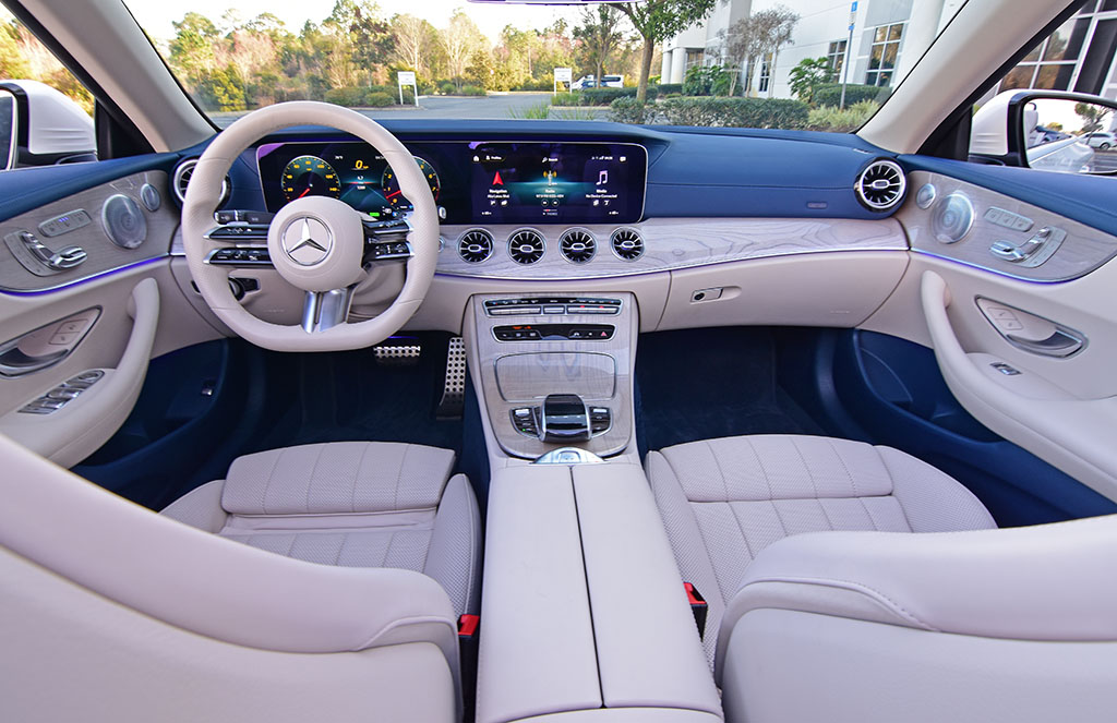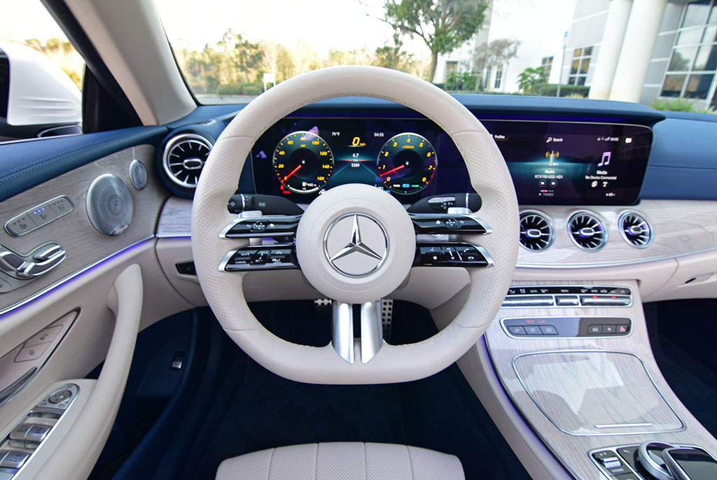 The interior of the new Mercedes E450 Cabriolet is full-on classy, from the accented “Yacht blue” color of the soft-touch Nappa leather dashboard and door trip above the beltline, to the Macchiato beige leather seats and high-gloss light brown Sen Wood trim, my E450 Cab has quite the luxurious and inviting cabin. In the modern tradition of Mercedes-Benz, the updated E450 Cabriolet has the same dual 12.3-inch screens, one acting as the configurable gauge cluster and the other as the touchscreen for the latest MBUX infotainment unit. Oddly enough, the E450 Cabriolet still utilized the same previous-generation touchpad and COMMAND control turn-knob instead of the updated touchpad for interacting with the new MBUX system. Still, the system works as expected with its slight learning curve and deep integration of several simplistic vehicle settings and the use of the nifty voice interaction by saying “Hey Mercedes”. Other eye-catching attributes throughout the inside of the E450 Cabriolet are its updated steering wheel that only has pressure-button areas but adds additional button functions through touch-capacitive areas. Additionally, the expected 64-color LED ambient lighting throughout is a unique touch that also delightfully lights up the several dashboard climate vents. Speaking of climate vents, the climate control system is just as sophisticated as the EQ-Boost mild-hybrid system. It knows when the top is down and shoots extra heated air when the temp is low outside. Additionally, the clever AIRSCARF heated neck vents in the front-seat headrests come in handy for those cooler top-down drives.