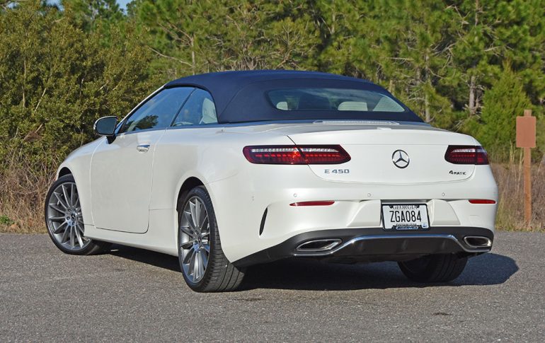 Handling for the E450 Cabriolet feels a bit uneasy at first, and you tend to feel a bit of extra heft possibly from the convertible top’s mechanics, which enable you to lower or raise the top when driving up to 37 mph. Otherwise, the E450 tackles twisty roads without too much complaint other than the suspension being tuned more to the soft side. The air suspension setup on my E450 Cab test vehicle is soft, even when it is placed in the Sport+ drive mode setting, one of three modes for the adaptive dampers. While the air springs lower the vehicle a bit in Sport or Sport+, the E450 Cabriolet still feels soft but remains mostly buttoned down when riding over rising road surfaces, bumps, and undulations. Here, I imagine the more stable setup is reserved for the AMG E-Class.