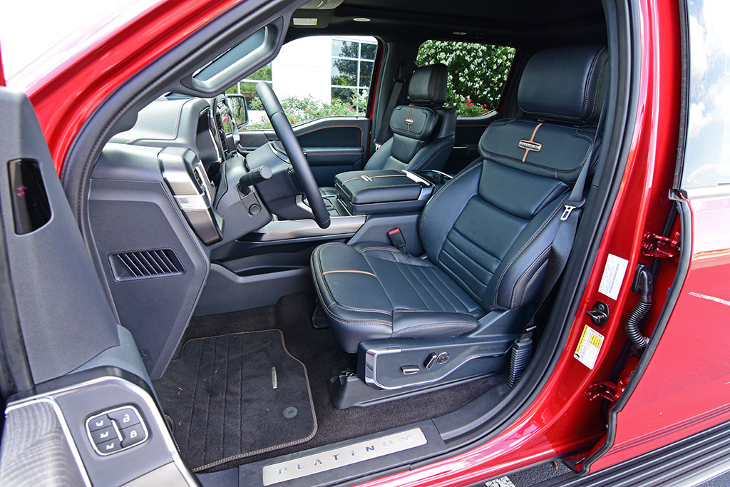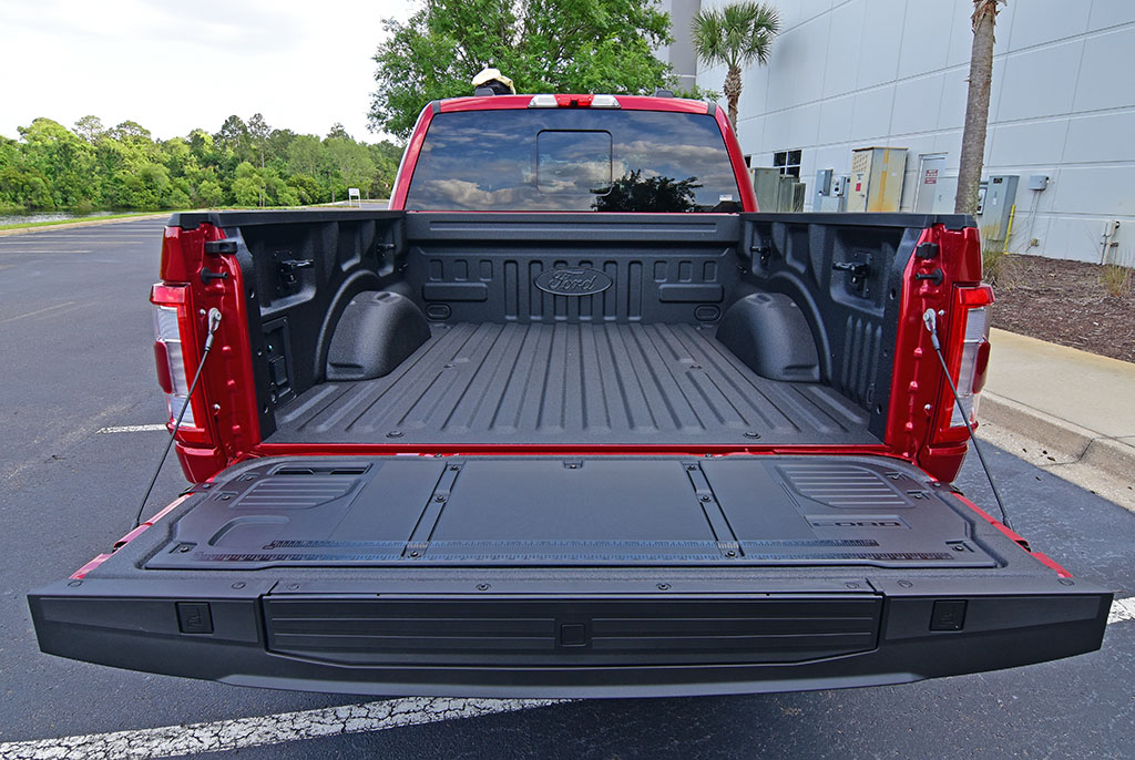 Inside is a slightly reworked cabin that brings highlight to the new trick shifter that can be power-folded flat to make way for the fold-out worktable transformed from the center console revealing a rubberized flat surface. Using wireless Apple CarPlay and Android Auto or enabling them through the USB port brings a welcomed level of connectivity to the new Sync 4 system, as does the wireless over-the-air system updates. Overall, the Sync 4 system nicely polishes the outgoing setup but still has a few system glitches and hiccups, even in the digital gauge cluster where items failed to display certain functions or would load a ghost alert. It’s possible that the small glitches are something Ford will work out soon with additional production units or a simple over-the-air system update.