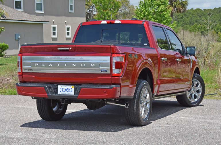 As far as drivability, the F-150 PowerBoost feels right at home for what you expect out of a loaded-up F-150 in my test vehicle’s top-level PowerBoost Platinum trim. Still, the ride quality isn’t as good as what you get in a comparable RAM 1500 as the rear of the Ford still has leaf springs. Still, there’s a lot to like and take literal comfort in with massaging, heated, and ventilated front seats that proved to be exceptionally comfortable. Where the hybrid part of the F-150 PowerBoost matters most for some, the fuel consumption is surprisingly consistent. The EPA-estimated 24 mpg city and 24 mpg highway, “24 mpg combined” (that’s not a typo) are attainable numbers in the real world. I saw many times when keeping pace with speeding highway traffic a nice 23.4 mpg at the end of my trip and other times as low as 22.1 mpg. I was able to hit around 24.2 mpg a couple of times, which required a little finesse with the gas pedal to keep the truck in electric-only mode, which is something that leaves you guessing as there is no gauge to indicate where your throttle application will kick over the gas engine. Over a total of 354 miles, I averaged 21.1 mpg – and that included some fun time pushing the truck hard and accelerating to 60 mph in 5.3 seconds a few times. Another benefit is the new 2021 Ford F-150 PowerBoost 4×4 has an astonishing range of about 700 miles out of a single 30.6-gallon tank of fuel. Also, to really push things into a new world, the F-150 PowerBoost 4×2 gets up to 26 mpg, and that yields a range of around 750 miles!