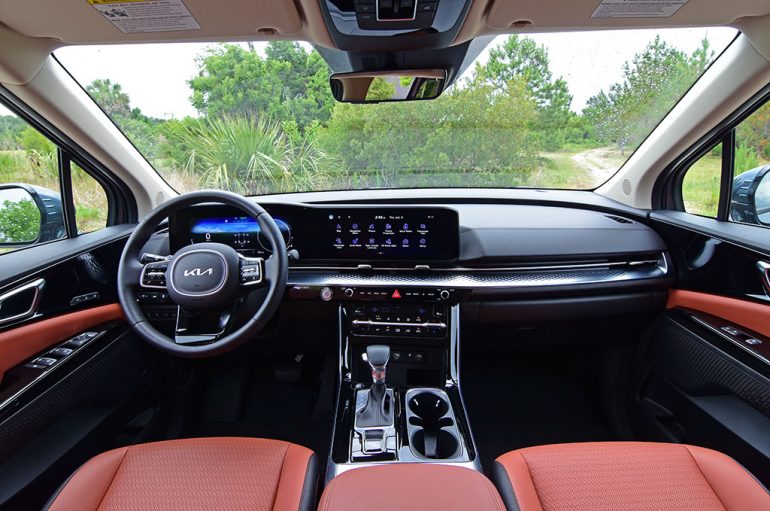 There’s plenty of “items,” comfort, and accommodations to be explored in the new Kia Carnival starting with the comfy seats up front with heating and ventilation in the SX Prestige trim. The amount of tech filling the cabin is welcomed, as there’s a 12.3-inch infotainment touchscreen along with an equal-sized customizable gauge cluster that conveniently displays a live feed of your corresponding blind spot side when you toggle your signal – a feature I’ve loved for years since Kia and Hyundai introduced such. The controls, with just the right number of buttons, are all easy to reach and mostly user-friendly even though the physical buttons are the capacitive touch type. There’s a clever passenger talk system and video monitor that can be brought up to project the driver’s voice to the rear passengers along with viewing a live feed of each occupant in the rear via the large touchscreen. There’s even a safe exit assist that helps prevent rear passengers from opening one of the power-sliding doors from opening into traffic approaching from behind. The power-sliding doors operate smoothly with slow down to help prevent finger pinching even though there are the proper pinch sensors that will reverse the door operation if it senses an object in the way.