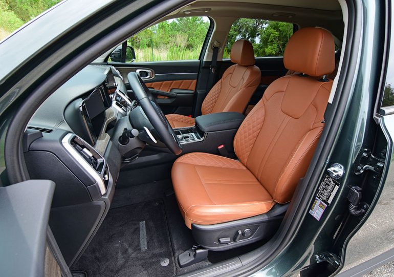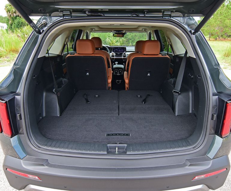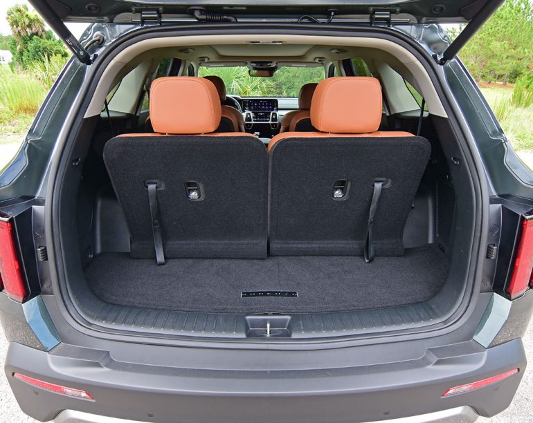 The interior seating positions are optimal for the driver and front passenger, which get heated and ventilated front seats. Out back, the second-row captain’s chairs are comfy, and having the convince of a folding third row in the Sorento is a plus, even if there is not much legroom for the two additional passengers or much cargo room behind the third row. The second-row chairs also have a quick forward half-fold and slide action for relatively easy access to the third row but may not accommodate a child’s seat to remain in place for the full forward-slide motion. As a 6-passenger crossover, the Sorento is great for toting around the extra fifth and sixth passenger in a pinch.