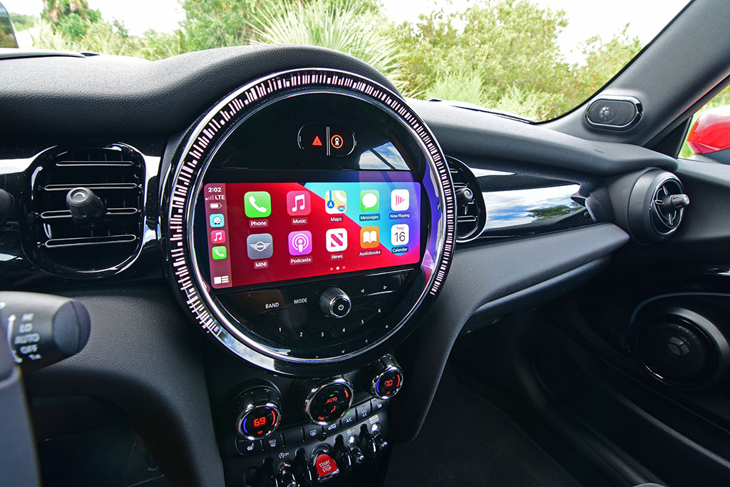 When most think of a MINI Cooper they think there’s some compromise in space. Sure, such is true when it comes to the two cramped back seats but up front there’s a surprising amount of room, more than enough for someone that’s 6-feet tall. This is where I’ve always enjoyed the spirit of the MINI Cooper, its unique styling and shocking interior proportions make it a fun car that doesn’t compromise much on comfort, other than the harsh ride quality found in my test vehicle. There’s plenty of BMW tech to go around, including the latest bits of the iDrive infotainment system with a wide touchscreen within the traditional circle center stack of the dashboard with fancy customizable LED lights in the surrounding translucent ring. While mostly everything about the unit is shrunken to smaller proportions, even physical iDrive controller and buttons, there’s still a welcomed ease of usability and integration of wireless Apple CarPlay. The smallish gauge cluster is a combination of a center digital LCD information screen, a fixed RPM gauge on the left, and an LED-lit fuel gauge with lit-block indicators on the right housed in a heavily anti-reflective mate-finished encasing. There’s also a self-contained color heads-up display that may get a little lost with the lines of the dashboard.