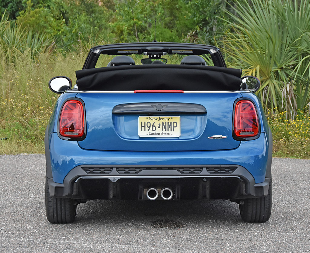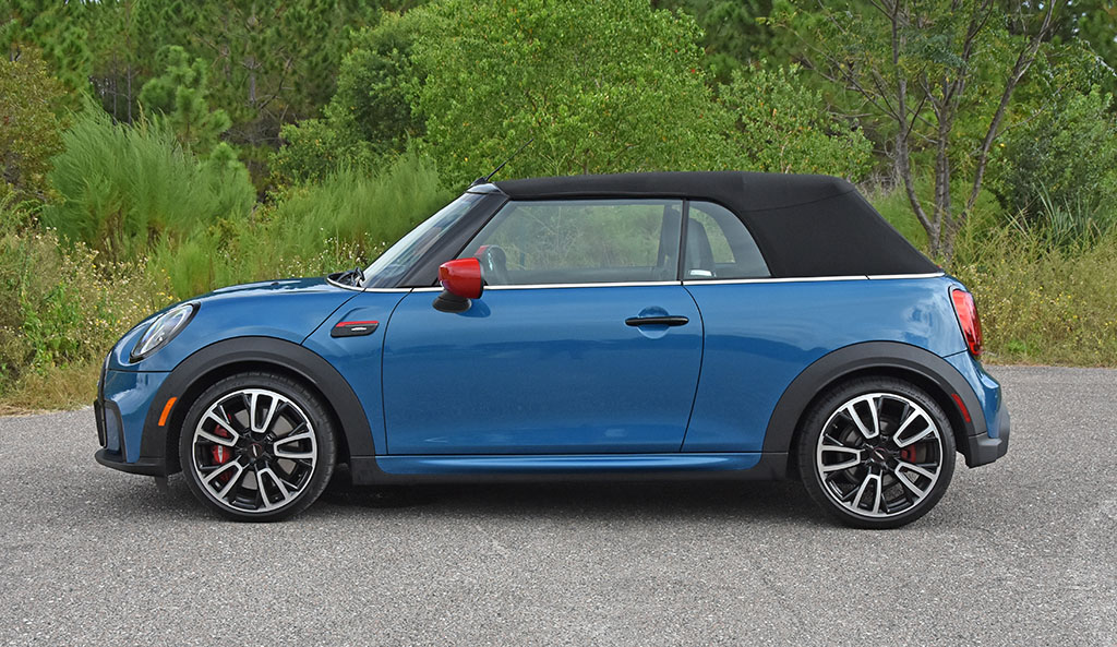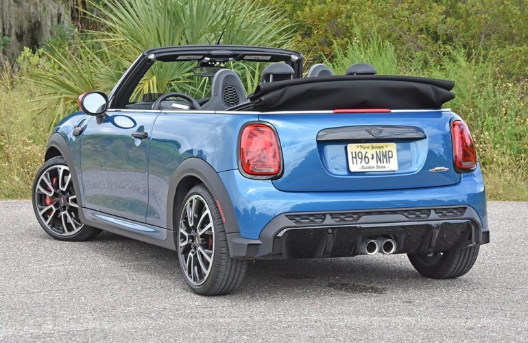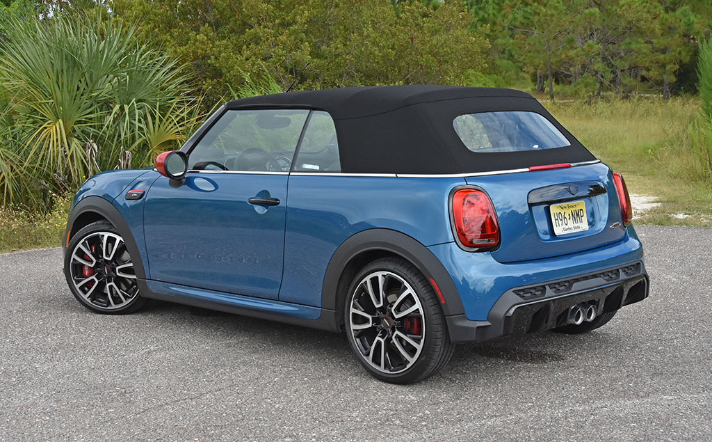 The MINI John Cooper Works Convertible scoots along well with 0 to 60 mph taking place in 6.3 seconds, but that’s about where the fun for me starts and ends. Sure, the MINI is lively in a straight line and even inspires a bit of twisty fun on back roads. However, there’s a bit of unwanted body roll for such a small and otherwise nimble vehicle. I fault part of that disappointment to the convertible’s extra curb weight over its hardtop sibling, which is about 200 more pounds and about 250 pounds over the manual transmission MINI John Cooper Works Hardtop. 200 pounds may not seem like a lot, but when the curb weight is relatively low, every bit of extra weight matters and it seems exacerbated in such a small vehicle. The 18-inch wheels, which look a little silly due to their protruding center hubs, are wrapped by very low-profile tires that unfortunately amplify the harsh ride quality that’s often upsetting for the MINI. The good part about the drive of the MINI John Cooper Works Convertible is that it is consistent with its fuel consumption and has the BMW-inspired drivetrain that’s often predictable for its power that feels a bit more than tie 228 horsepower on paper. EPA fuel estimates are 24 mpg city, 33 mpg highway, and 28 mpg combined.