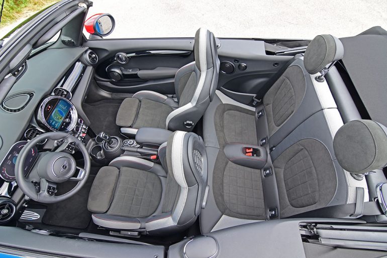 The small sporty heated front seats are supportive and have just enough adjustments and a thigh extender to be okay for a couple of hours. While the seating position is a bit different from “normal” sized vehicles, the MINI layout is fun and engaging but limited on visibility with the top up. Speaking of the top, the soft folding top has a trick of acting as an open-air sunroof or a full convertible with the top fully power-folded down.