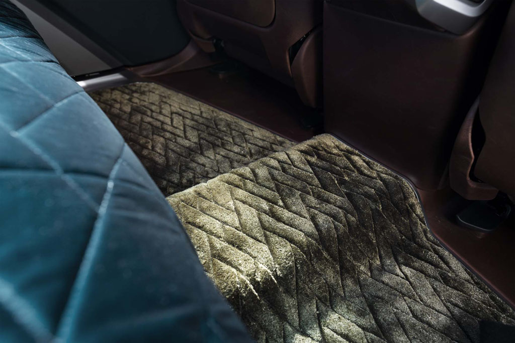 To keep things “real”, what we see here is still just a concept, but many elements may make it to production as the interior is a fully functional space that has many familiar traits from current BMW vehicles. Where things tend to change greatly is the choice of materials, such as aged, tanned leather, and carbon-copper weave trim. Other interior elements include a new gauge cluster screen and infotainment touchscreen that both flow with a mimicked size and look, much like you see in current Mercedes-Benz MBUX setups. However, the screens as one large unit are curved for a unique aesthetic. Where things start to really depart from anything we’ve seen before is the rear seating, or backstage area as they call it, that is a luxury oasis fit with a rear bench seat laced with large diamond stitched pattern lower portions of the seatbacks and bottom cushions featuring a petrol fabric. The velvet-like fabric captures your eyes and probably feels plush to the touch. It all looks more Star Trek-ish to us, but we can dig it, because LUXURY and performance!