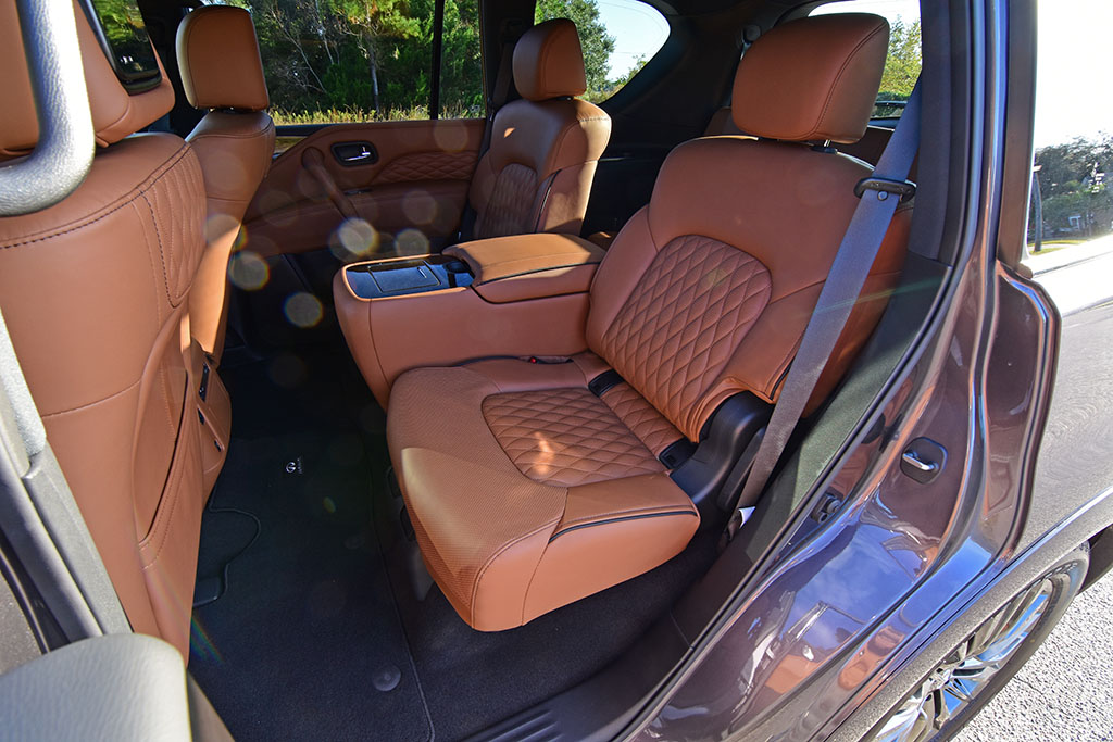 The luxury appointments of the Infiniti QX80 only go so far as the cabin is a bit outdated at this point when compared to direct competitors. However, there’s still a good use of space with the one exception of the driver’s seat not adjusting back far enough for my tastes with me being slightly over 6-feet tall. You would expect an SUV of such a large size to have more than enough legroom up front but the QX80 still keeps such room a little shorter than I would like. The second-row heated chairs are heavily padded and nearly as comfy as the heated and ventilated front seats with plentiful space for adults of just about any size along with a center storage armrest with cupholders. The third row remains to be an inviting space with decent room where when the seatbacks are power-folded down the cargo area opens up nicely to expand on the 16.6 cubic feet when the third-row seatbacks are in place. Fold down both the second and third-row and you have a vast 95.1 cubic feet of cargo space to work with.